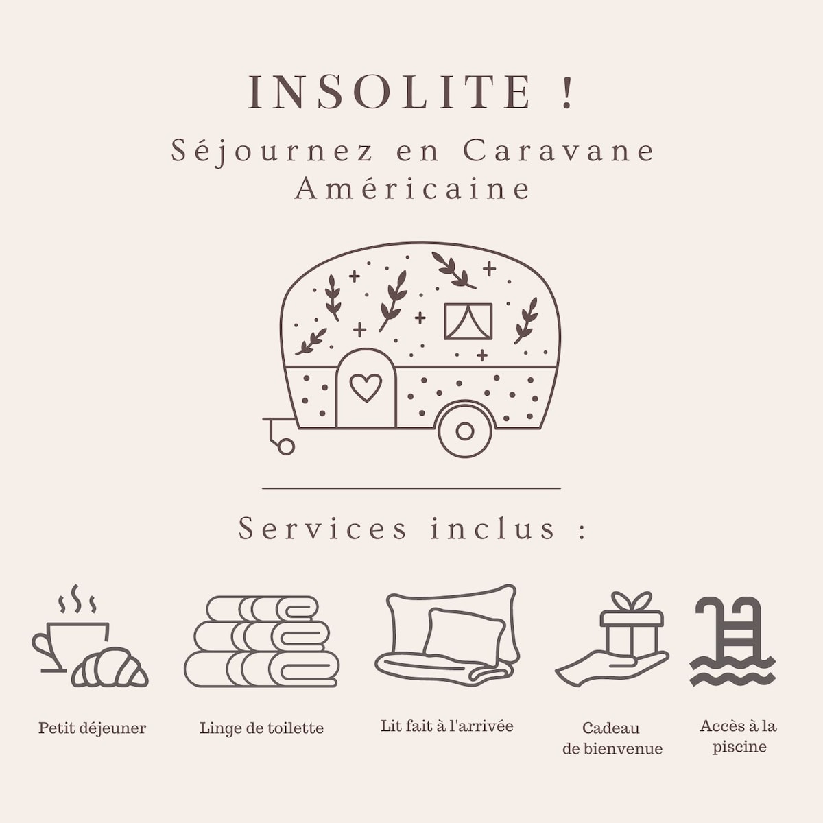 Capacité : 2 personnes Lit 140, couette, couverture, oreillers Lit fait à l'arrivée et linge de toilette fourni Petit déjeuner servi au restaurant Attention d'accueil Ménage de fin de séjour Pas de possibilité de cuisiner dans la caravane « Hollywwood » Cafetière et bouilloire électrique Kit vaisselle pour une « dinette » (tasses, verres, assiettes, couverts)
