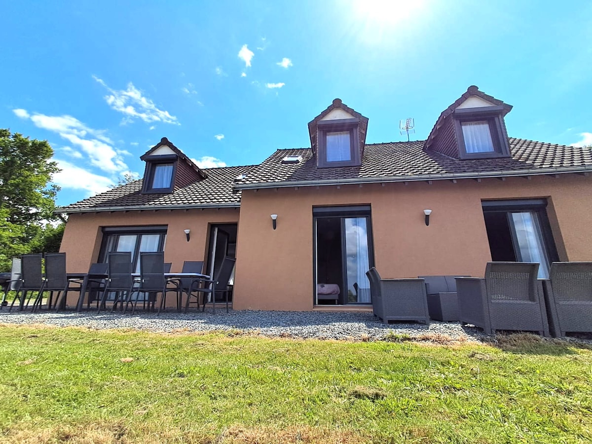Au calme ,une maison confortable et spacieuse pour toute la famille :3 chambres à l'étage:1 chambre 1 lit 2 pers + TV +lit Bébé, 1 chambre 2 lits 1 pers+ lit à barreaux,1 chambre lit 2 pers+lavabo, cuisine salle à manger avec cheminée , salon TV canapé + fauteuils ,terrasse table extérieure, parasol, BBQ, chaises longues et jardin clos ,accessibles directement de la baie vitrée coulissante, parking privé, accès indépendant.Jeux extérieurs .Animal accepté.Boite à livres sur place et brochures .