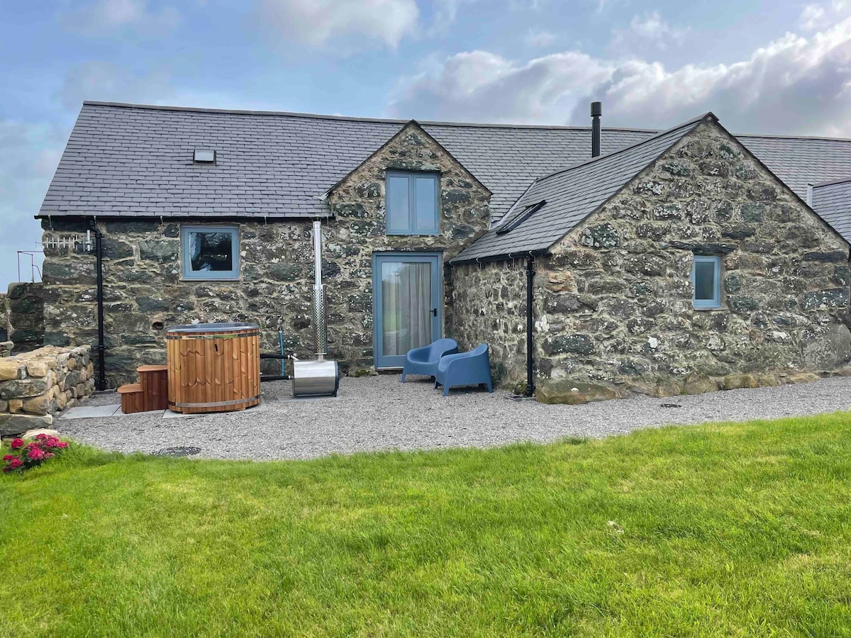 Luxurious and very spacious double height barn conversion located outside the village of Y Ffôr. 5 minute drive from the market town of Pwllheli and on the door step of Pen Llyn's sandy beaches. The Barn is also a short drive into Snowdonia with views of Y Wyddfa (Snowdon) from the bedroom. Wood fired hot tub and wood burner. Oak and marble floors, freestanding bath, thick granite slab shower, granite and oak kitchen with plush velvet sofa gives the barn a very premium finish.