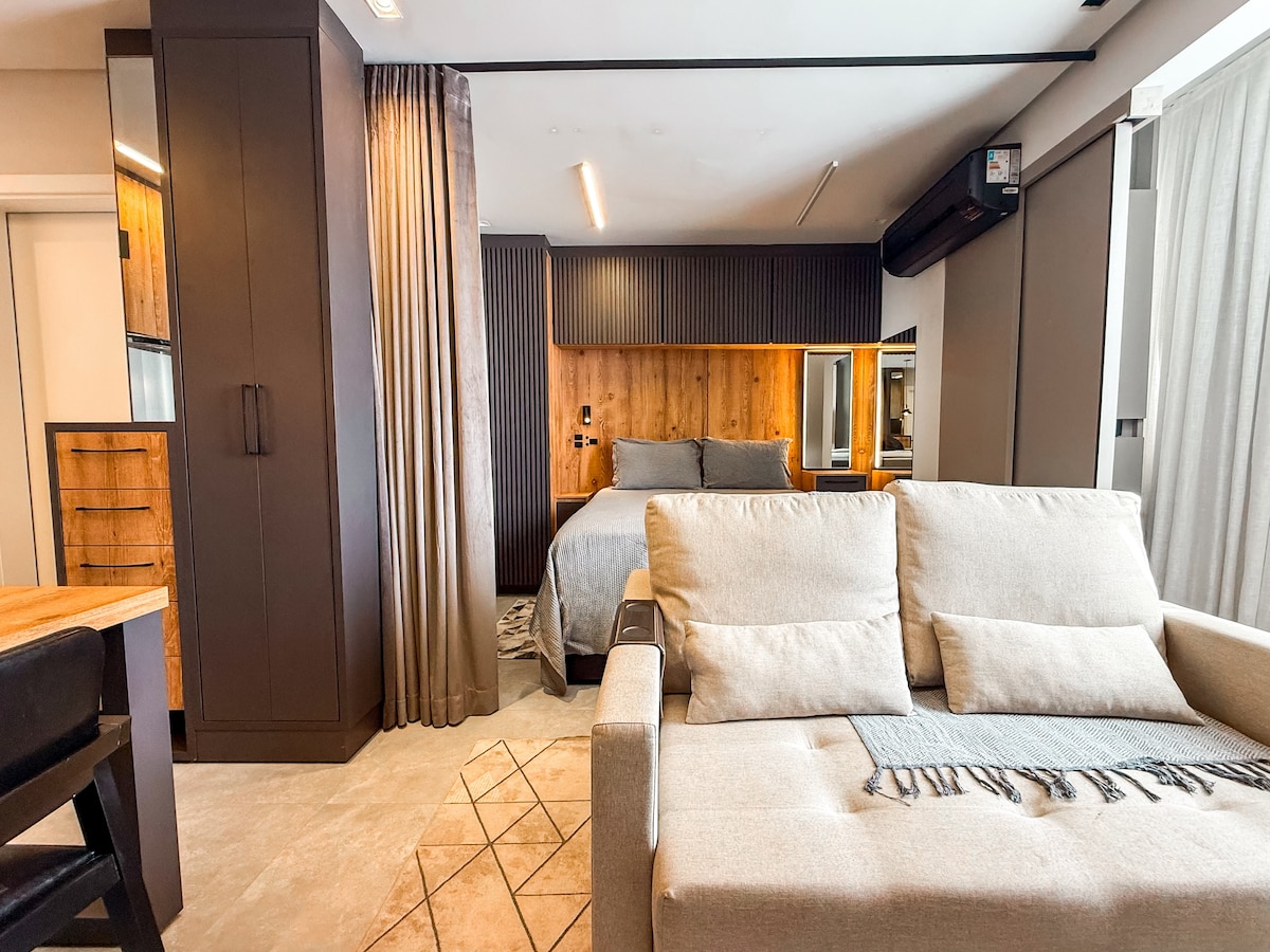 Nosso apartamento studio oferece um ambiente confortável e lindamente decorado, perfeito para quem busca qualidade e praticidade. Desfrute de uma cozinha completa, equipada com louças e utensílios, além de água quente em todas as torneiras. Roupas de cama e banho de alta qualidade garantem uma estadia ainda mais agradável, e a garagem privativa proporciona toda a comodidade que você precisa. Não aceitamos pet e é estritamente proibido fumar dentro do loft e nas áreas comuns do edifício.