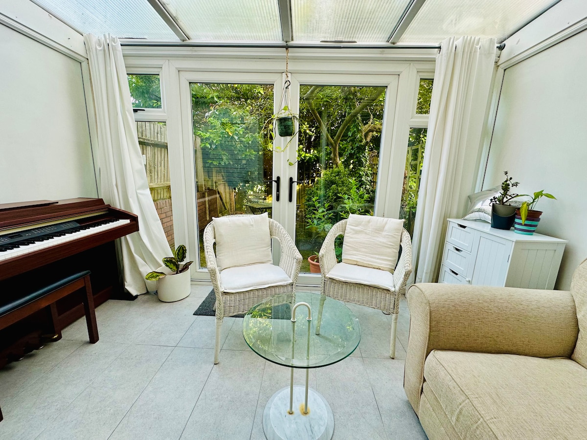 A completely self-contained private apartment with a studio bedroom/living area, a separate sun lounge, a separate kitchen, and a shower room. It overlooks a quiet garden and is located in a very safe area. Around the corner are coffee shops, restaurants, banks, pharmacies, and is a 3 minute walk from the nearby tube (rapid commuter train) station. We have a new luxury standard double bed and a good quality new single sofa-bed suitable for either a slim adult or a child.