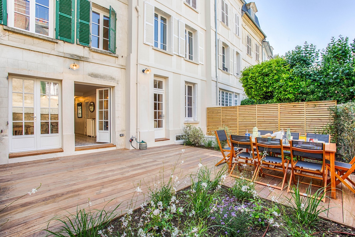 Maison de ville de 120 m2 idéalement pour 6 à 8 personnes sur 4 niveaux ( 4 ch/2 sdb) Dans une ambiance chaleureuse, cette maison de caractère fin 19° saura vous séduire par son charme et son authenticité. Proche de toutes commodités : Tout à pied : 5 mn de la gare SNCF, 3 mn de tous commerces et du marché, 15 mn de la plage et 3 mn du pont des belges pour un accès rapide à Deauville (plage et place Morny). Vous pourrez profitez du jardin entièrement clos et d'une place de parking privative