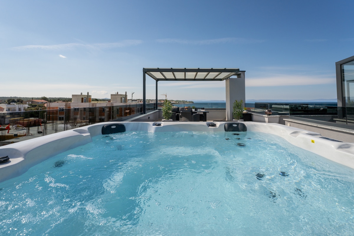 Luksuzni Penthouse s Pogledom na More i Jacuzzijem u Zatonu! Doživite nezaboravan odmor u našem prostranom penthouse apartmanu (115 m²) u Zatonu kraj Zadra, udaljenom samo 80 metara od mora. Idealan za do 6 osoba, ovaj luksuzni smještaj nudi krovnu terasu s vlastitim jacuzzijem (samo za goste ovog apartmana) i spektakularnim pogledom na more. Uživajte i na terasi u produžetku boravka s zidanim roštiljem. Osiguran je i besplatan parking unutar dvorišta, zaštićen kamerama. Vaša oaza mira čeka!