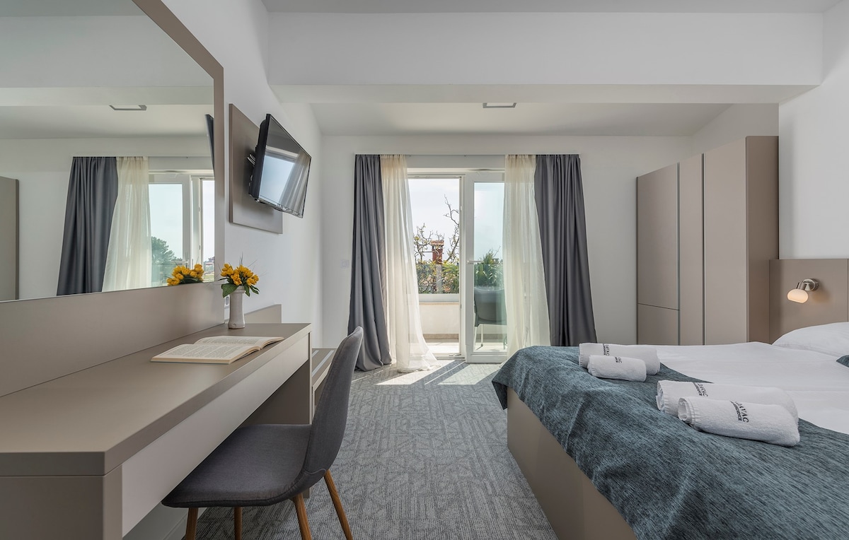 Enjoy your stay at Casa Benita Hvar, a guesthouse designed for relaxed, modern island living. Each morning, enjoy a fresh breakfast delivered to your room—INCLUDED in the price. Unwind in a cozy double bed with Netflix TV, a stylish make-up mirror and an in-room bathtub. Your private balcony with seating offers a peaceful spot to unwind with a partial view of the sea. This studio also features a fully equipped kitchen with an island, perfect for cooking during your stay.
