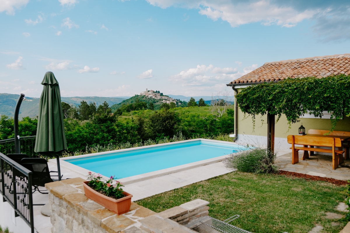 NEW - heated pool! Small, cosy and secluded house located in the village of Kranceti (1 kilometre from Motovun), suitable for four people. The house it's perfect for couples, families, and individuals who seek soothing, healthy and active experience. There is a private swimming pool with a stunning view of Motovun and an outdoor table and chairs, perfect for breakfasts or romantic dinners.