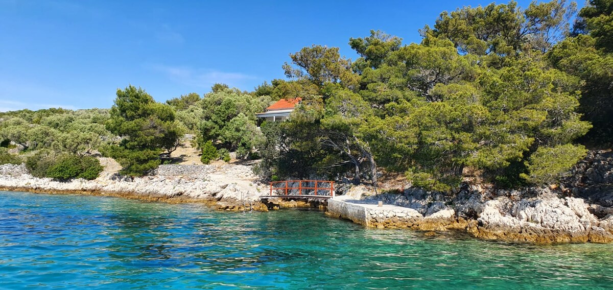 Contemporary Hidden Paradise is an isolated house located in a bay of Zizanj island. It belongs to the Kornati archipelago. Zizanj has no cars and is reachable only by private boat. There are 5 houses in the bay, all very private from each other. There is a restaurant 15 minutes walk away. Completely renovated, the house consists of an open-space with designer furniture, an open-plan kitchen, a bathroom with walk-in glass cabin shower, a terrace with an amazing view and a private pontoon.