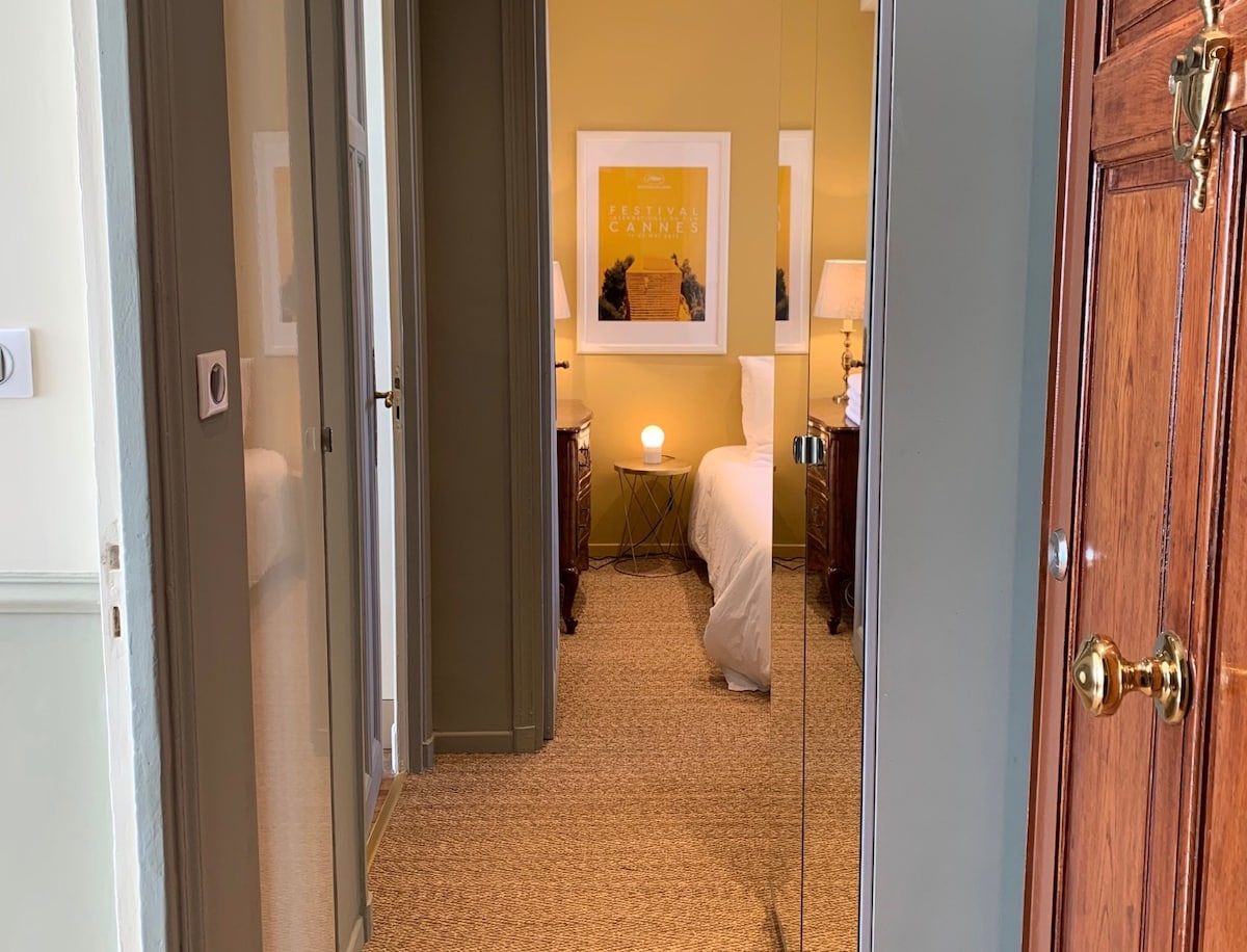*Le Bourgeois* 3ème étage AVEC ascenseur. Venez profiter d'un moment hors du temps en posant vos valises dans ce logement situé dans un magnifique immeuble bourgeois cannois de 1930. Localisé au coeur de l'hypercentre de Cannes, cet appartement 3 pièces peut accueillir jusqu'à 4 voyageurs. Le Bourgeois a été entièrement rénové en avril 2024 pour vous apporter le confort nécessaire tout en conservant son charme & son authenticité. Voyagez léger, les linges de bain & lit sont fournis.