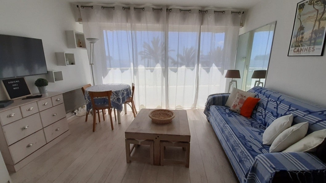 Appartement haut de gamme refait à neuf JUSTE DEVANT LA PLAGE, à seulement 10 SECONDES à pied de la plage, en plein CANNES. PALM BEACH Living room avec baies vitrées ouvrant sur TERRASSE en rez de JARDIN PRIVÉ rien que pour vous 2 chambres confortables. 2 douches 2 wc. Chauffé, clim Équipement de qualité. Fibre Quartier STATIONNEMENT GRATUIT. Bus station COMMERCES RESTAURANTS Dans CANNES quartier chic et touristique Croisette PALM BEACH PANIER PETIT-DÉJEUNER et les FRAIS DE MÉNAGE OFFERTS.