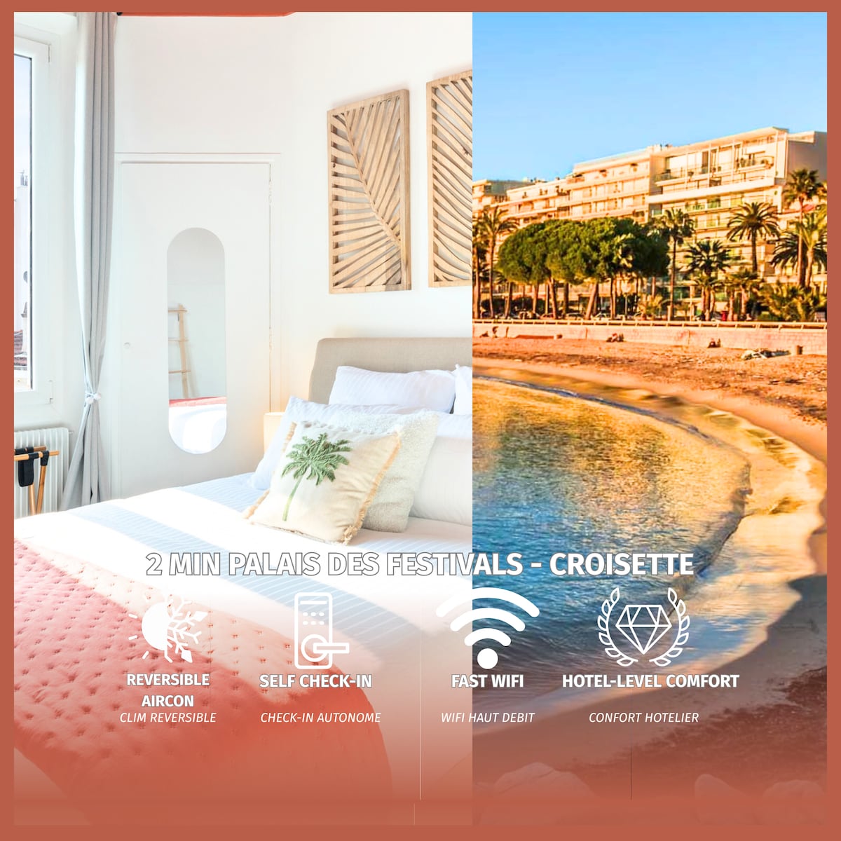 Appartement d'architecte classé 4 étoiles, 47m2 Vue Mer & Balcon, face au Port, Plage, Palais des Festivals, emplacement central > en face du Palais des festivals /Plages : 2 min / gare : 5 min > Proximité immédiate des boutiques, Croisette, restaurants tout en étant au calme > Lits préparés (matelas Bultex 30 cm , confort hôtel - Draps, Serviettes , gel douche, shampooing fournis > Wifi haut débit , Netflix, Climatisation réversible, cuisine équipée, machine Nespresso, café, thés Self Check-in