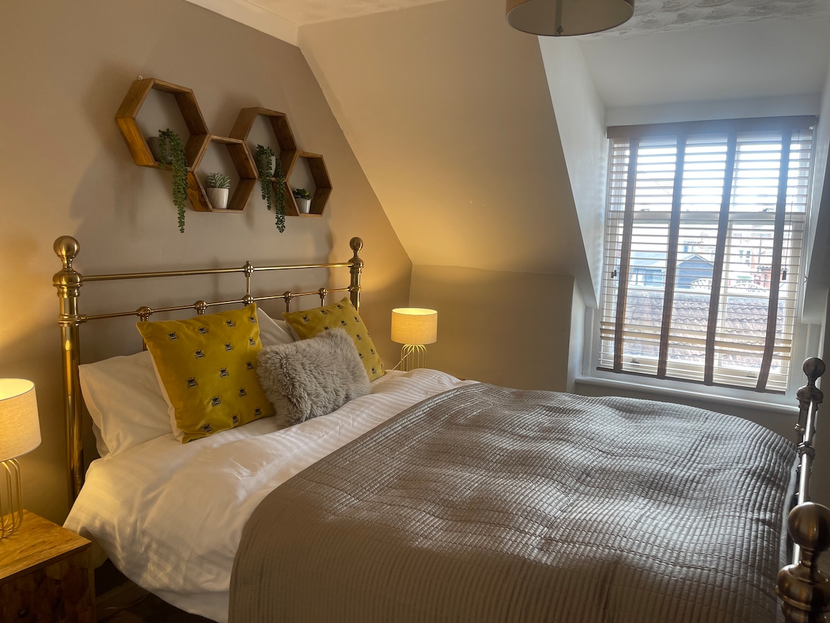 Literally a ‘Stone’s Throw’ from the beach, this stylish central first floor flat will fulfil all your holiday needs. The bright spacious sitting room and through kitchen offer easy holiday living. A cosy wood burner is a delight even on a summer’s evening. Relax in the bay window with its sea glimpses. The two bedrooms, one with a luxurious king size bed that converts into two singles if needed, make for a flexible stay for two couples or a family. All welcome, LGBT-friendly of course!