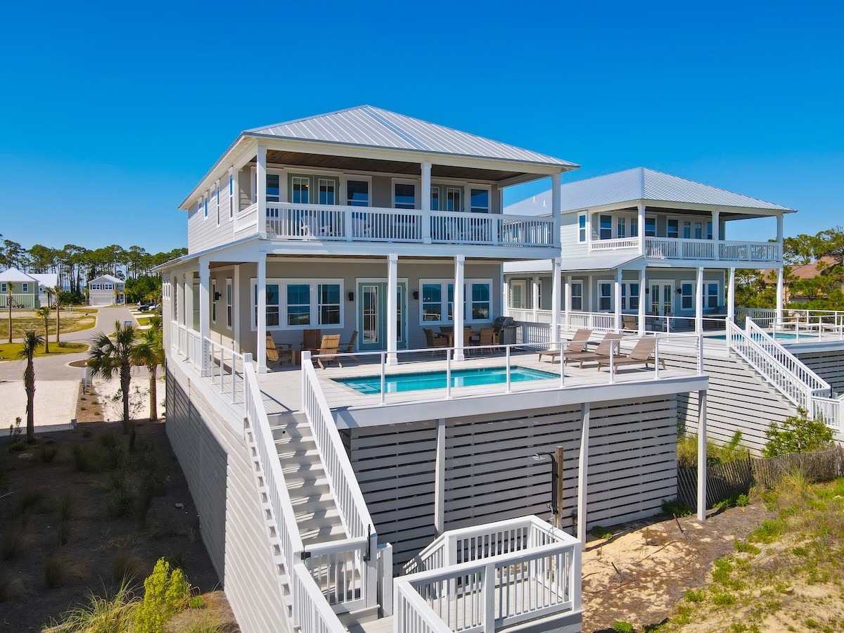 Amalfi - Inspired by Italy, Perfected in Cape San Blas Escape to refined coastal living in this stunning Gulf-front retreat. With panoramic ocean views, two spacious decks, and a private elevated pool, every detail invites relaxation and indulgence. This 5-bedroom, 5-bath home features a chef’s kitchen, spa-style suites, and direct boardwalk access to sugar-white sands. Nestled in a gated community with upscale amenities, it's the perfect blend of beachfront bliss and sophisticated style.