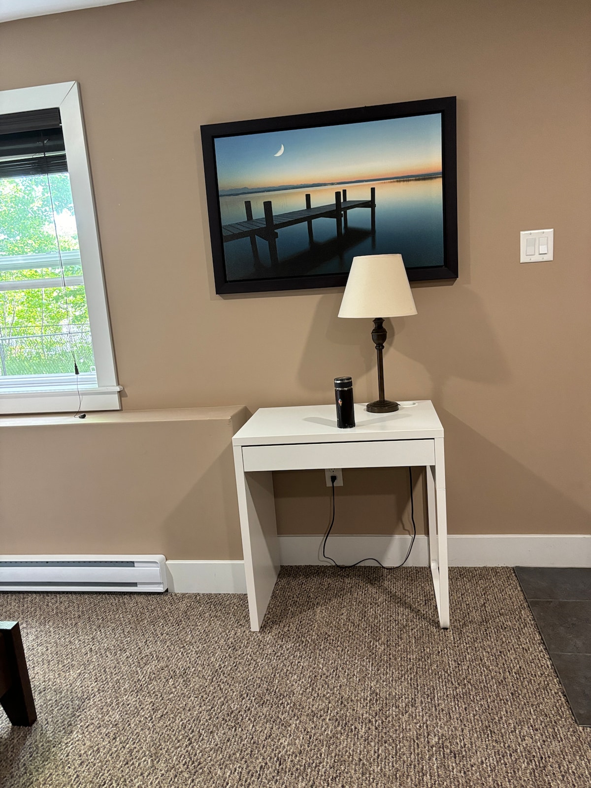 Kick back, reminisce and relax in this calm, stylish space. This basement apartment in South Bedford offers the most important amenities with class. The open concept sitting area is nestled between the dinning and equipped kitchenette. The bedroom offers a comfy king-sized bed, a working area, a dresser and a nightstand. The toilet is equipped with both automatic sensors and energy-efficient flushing mechanism. Finally, a heat pump helps moderate temperatures within the apartment all year round.