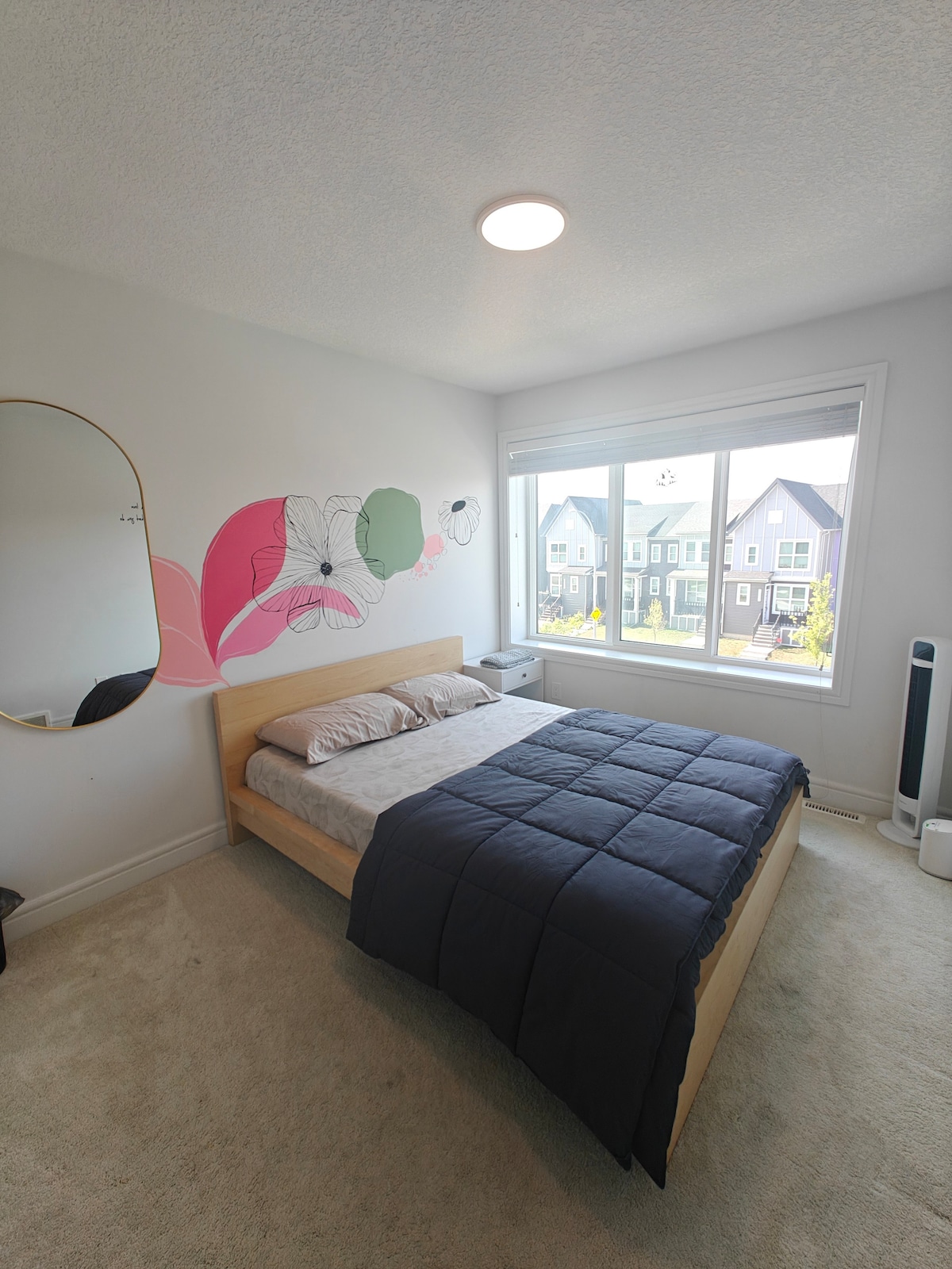 Come over to the spacious, clean and luxurious basement suite. • 9-ft ceiling legal basement suite (811sq ft) • Unlimited wi-fi & free Netflix • Spacious bedroom with King Size Bed • In-suite washer and dryer • Side entrance with number lock • Separate HVAC system & 2 standing fans • Less than 1 minute walk to the pond and playground • Less than 5 minutes drive to No Frills, McDonald’s, gas station, and restaurants • 15 minutes drive to Calgary Airport • Less than 25 minutes drive to downtown