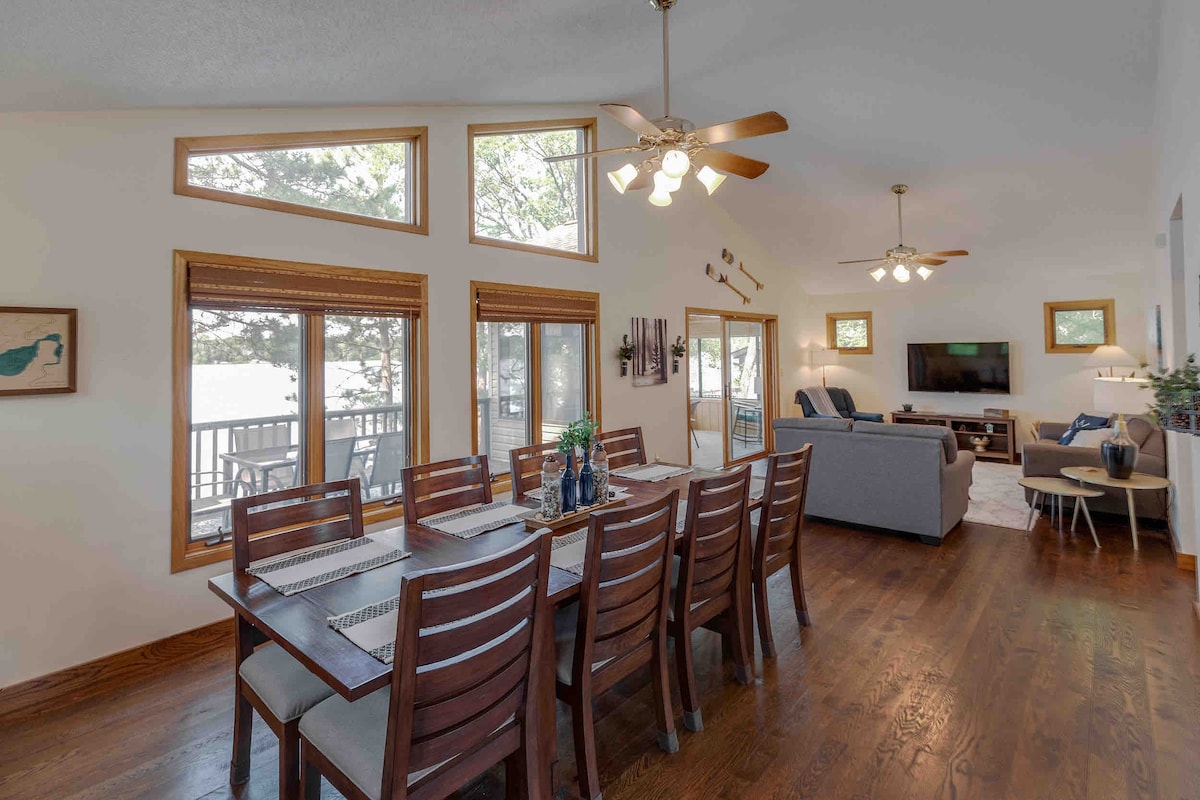 Celebrate the holidays lakeside! It doesn't get closer to the lake than this! Spacious 3 bedroom/2 bath home w/ two living areas & garage, nestled among the pines, & only steps from the water. Panoramic lake views throughout the main floor and 3-seasons room. Many lake toys included! Feel the comforts of home with a fully stocked kitchen, granite counter tops, SmartTVs in each bedroom, & luxury bedding. Close to everything. Welcome to Jack Pine Lodge in the heart of lake country!