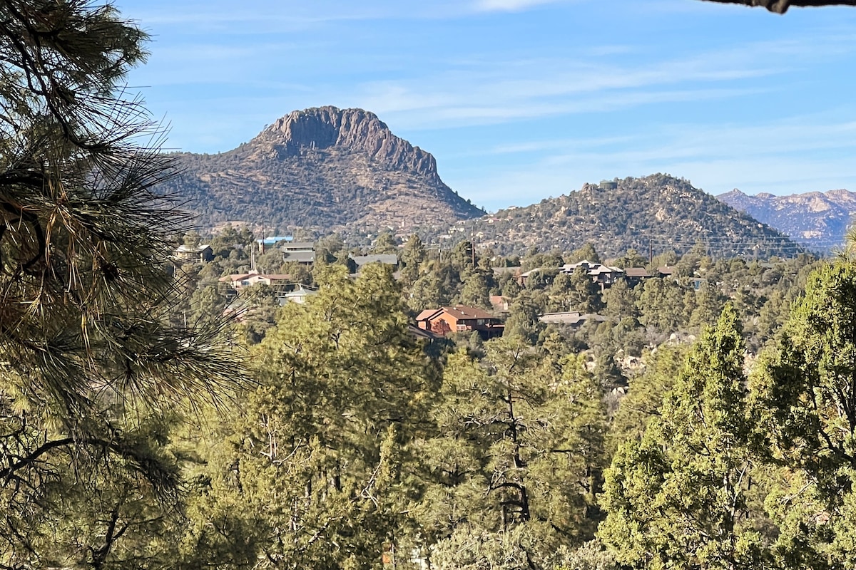 Escape away to our Castle in the Pines. Let your worries melt away whilst relaxing on the balcony with views of the pines and mountains. Surrounded by nature and wildlife, at 7700 elevation, but less than 20 minutes to the heart of downtown Prescott/Whiskey Row. Enjoy an abundance of indoor & outdoor games/activities/books/movies to keep any family entertained. Fully stocked kitchen, you never have to leave! Access to GREAT Wi-Fi so you can stream movies/work remote. PET FRIENDLY! Fees apply
