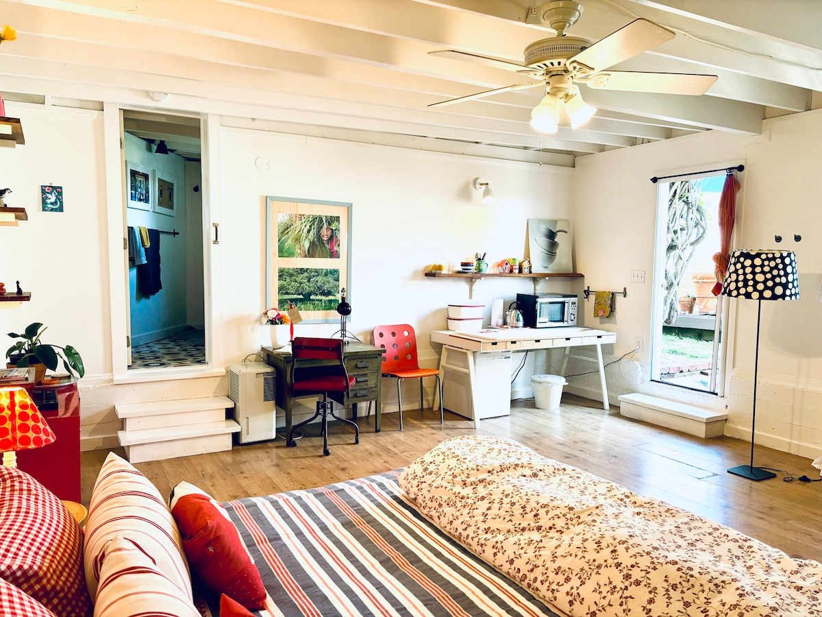 Enjoy this newly remodeled stylish studio in the heart of Ocean Beach. Light and bright with a refreshing ocean breeze from its large central window. It’s just over a half a mile to Dog Beach and a quick ride to Sunset Cliffs, with some of the best surfing and beaches in San Diego. This studio has its own private entrance, full bathroom with shower, and kitchenette. In addition, the studio includes a standing desk with a large second monitor to accommodate your remote working needs.