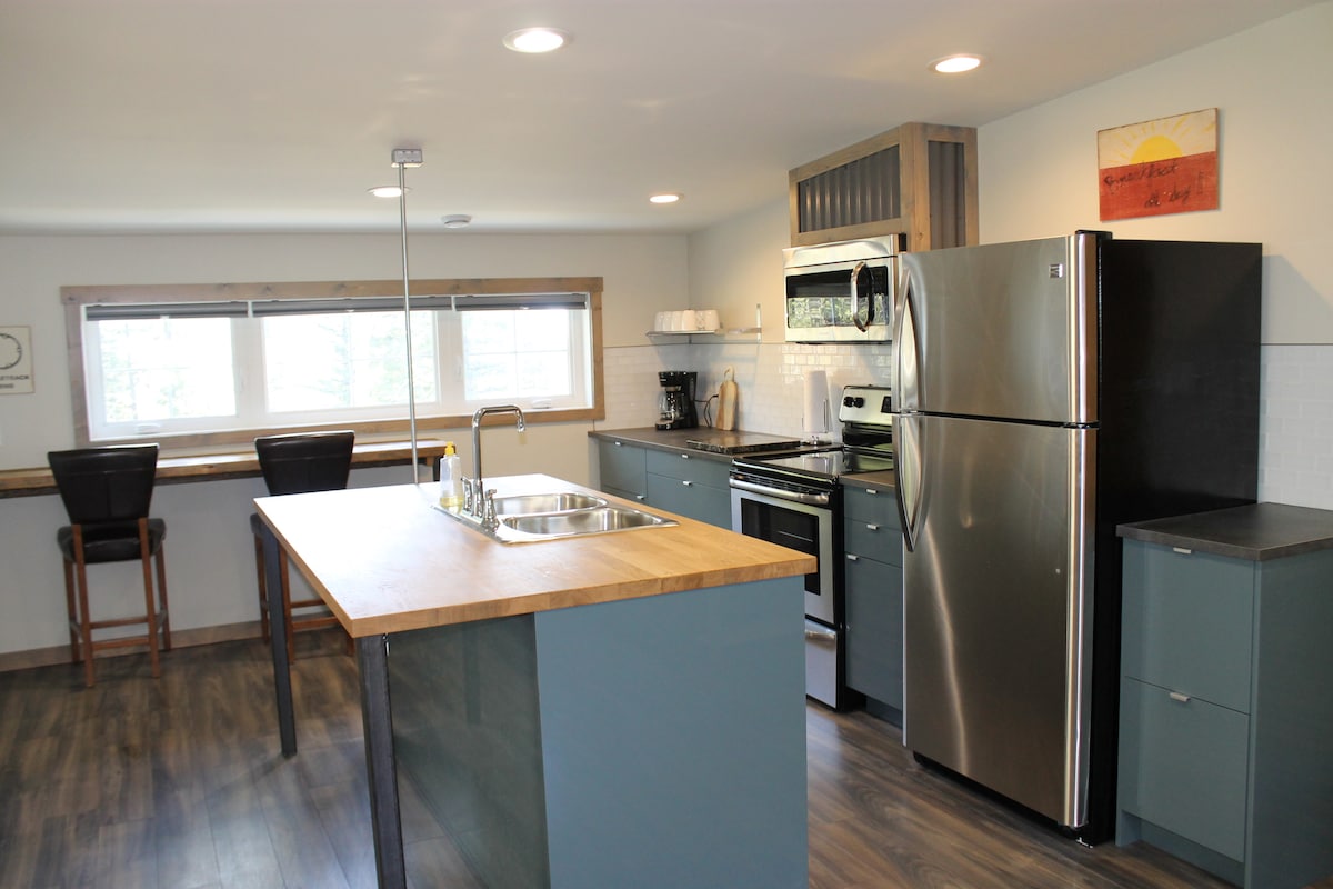 Alpenglow Escapes is a stylish guest suite in Crowsnest Pass - Coleman specifically. Ideal for relaxing or recreating, this "mountain modern" suite sleeps 2-3 (1 king sized bed, 1 pull out couch) has a full bathroom, fully equipped kitchen, Smart TV, gas fireplace, Wifi, private entry and parking. Ideal for singles or couples. Local Business Licence #0001572. Development Permit #DP2022-ST057.