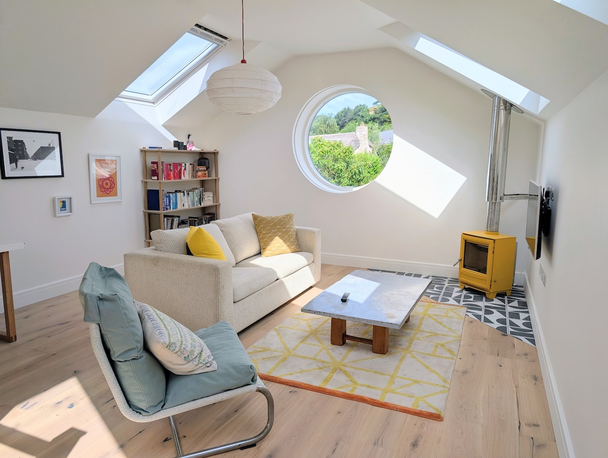 Board Room @ Green Rooms is a contemporary and spacious one bedroom apartment. 5 meter bi-fold doors from the living area open onto your own private South facing decked garden. A real suntrap with sun loungers and outdoor dining area to enjoy. A great nights sleep awaits you in the sumptuous super-king bed and in the morning roll back the huge sliding barn door to reveal the view of the sun coming up over Saunton Down right from your bed.
