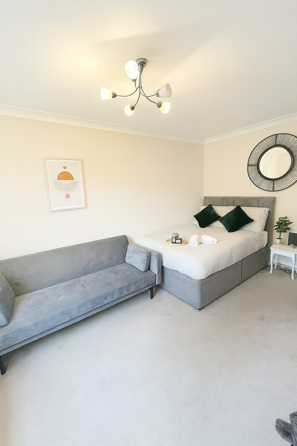 Relax in this charming 1-bed apartment just 25 mins from Central London. Enjoy a fully equipped kitchen, modern bathroom, double bedroom with office space, and a stylish living room with dining area and 42" TV. Perfect for couples, families or remote workers, with fast Wi-Fi, a bean-to-cup coffee machine, and a large board game collection for cosy nights in. A beautiful park and a large supermarket are just a short walk away.