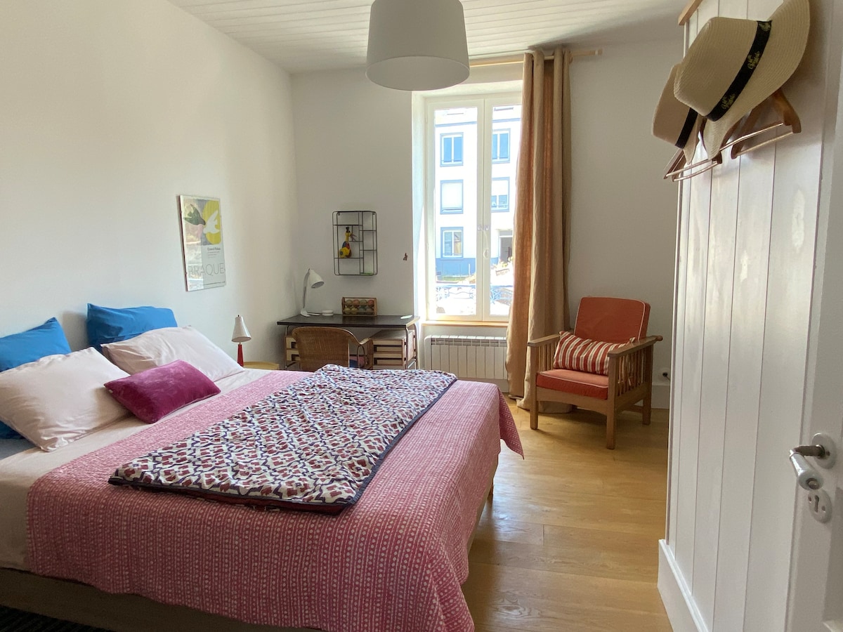 Je loue une chambre dans ma maison pour 2 personnes, entrée indépendante, chambre spacieuse avec WIFI. Salle de bain attenante à la chambre comprenant : un lavabo, une cabine de douche, W.C. Sur le même palier vous avez à votre entière disposition une petite pièce coin petit déjeuner avec bouilloire électrique, cafetière électrique, grille-pain et micro ondes. Vous êtes complètement indépendant, vous pourrez prendre votre petit-déjeuner à l'heure que vous le désirez. Je fournis le café, thé, chocolat, tisanes et pain 🍞 fait par moi-même. 😊 Située en plein cœur du quartier des artistes de Camaret, à 100 mètres de la plage, 30 mètres d'un parking gratuit, du port et tous commerces et restaurants. Si vous aimez marcher, de nombreux chemins de randonnées sur la lande qui longe la mer s'offrent à vous au sortir de la maison. Si vous n'avez pas de voiture, il y a des bus proche de la chambre.(30mètres.) Ils passent sur toute la presqu'île de Brest à Quimper. Durant votre séjour vous pourrez visiter La tour Vauban, la petite chapelle Rocamadour. Voir, La pointe du Toulinguet, la pointe du Pen-Hir et le tas de pois ainsi que le cap de la chêvre et l'île sauvage. Vous pourrez également prendre le bateau qui vous amènera sur les îles avoisinantes, l'île d'Ouessant et île de Bolène. Début août, vous pourrez assister au festival de musique très connu ' LE FESTIVAL DU BOUT DU MONDE.' Le petit déjeuner à la Française est servi avec le pain maison, confitures, beurre et yaourts et jus d'orange. Les frais de ménage sont également inclus dans le tarif de la chambre. Si vous avez la moindre question pour quoi que ce soit n'hésitez surtout pas à me contacter je vous répondrai avec plaisir.😊