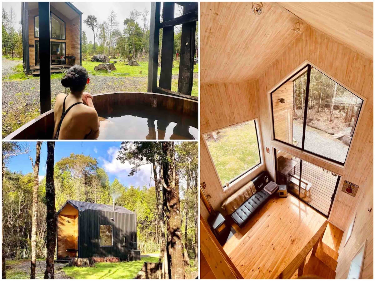 The Tiny House is for 2 PAX. We have a hot tub with an additional cost of 30 USD for 5 hours of use. It has to be scheduled with 24 hrs in advance cause it works with a heat pump. It has a queen bed, internet,TV, kitchen, Micro wave, etc. In a millenary forrest among Alerces, Peumos, Canelos and more. We are just 25 minutes away from Puerto Varas, 20 minutes away from Puerto Montt and 40 Minutes away from the airport. The check in is between 15:00 and 17:00 hrs and check out at 11:00 am.