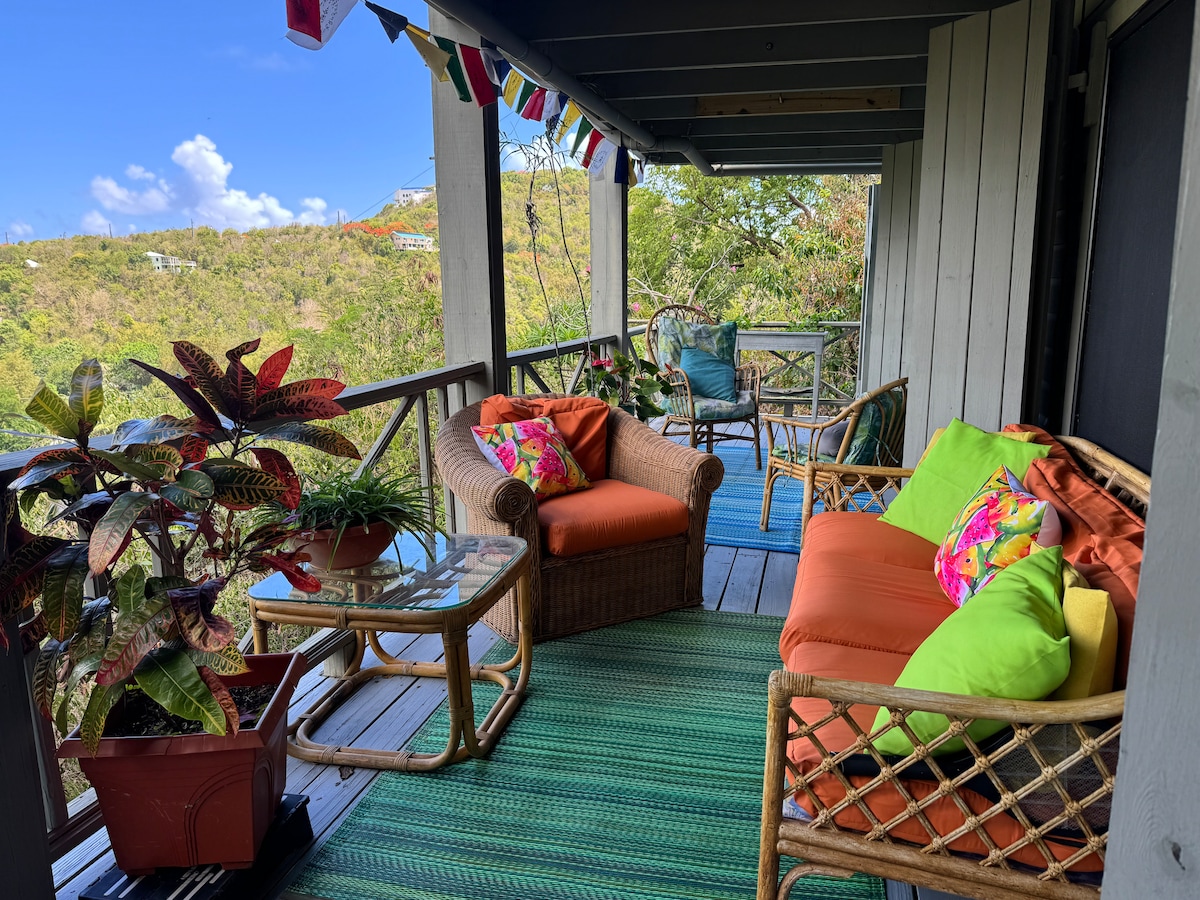 This very small 1 BR cottage lives BIG with a screened porch, SOLAR POWER, valley views, ac, dishwasher, outdoor fitness, and plunge pool. With a clean modern vibe, Sweet Spice is more laidback getaway than luxury villa. It’s an ideal HQ for 2 active STJ adventurers - but with a few extra amenities! Located off the beaten path on the quiet side of STJ, it feels secluded but is only a 5 minute drive to the shops of Coral Bay. Note: road is rough and requires a 4WD and there are LOTS of stairs.