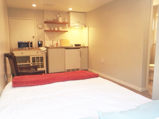 You will stay in a tranquil suite with a private entrance at the rear of our home. There is a shared wall with a secure door with locks on both sides for complete privacy. The 1-bedroom 1-bath suite features a kitchen with air fryer/toaster oven, electric skillet, 2 hot plates, microwave, refrigerator, and dishwasher. Sofa full size converts to sleep two. This sofa bed in the living room provides additional sleeping. We can provide a twin size aero bed as well.