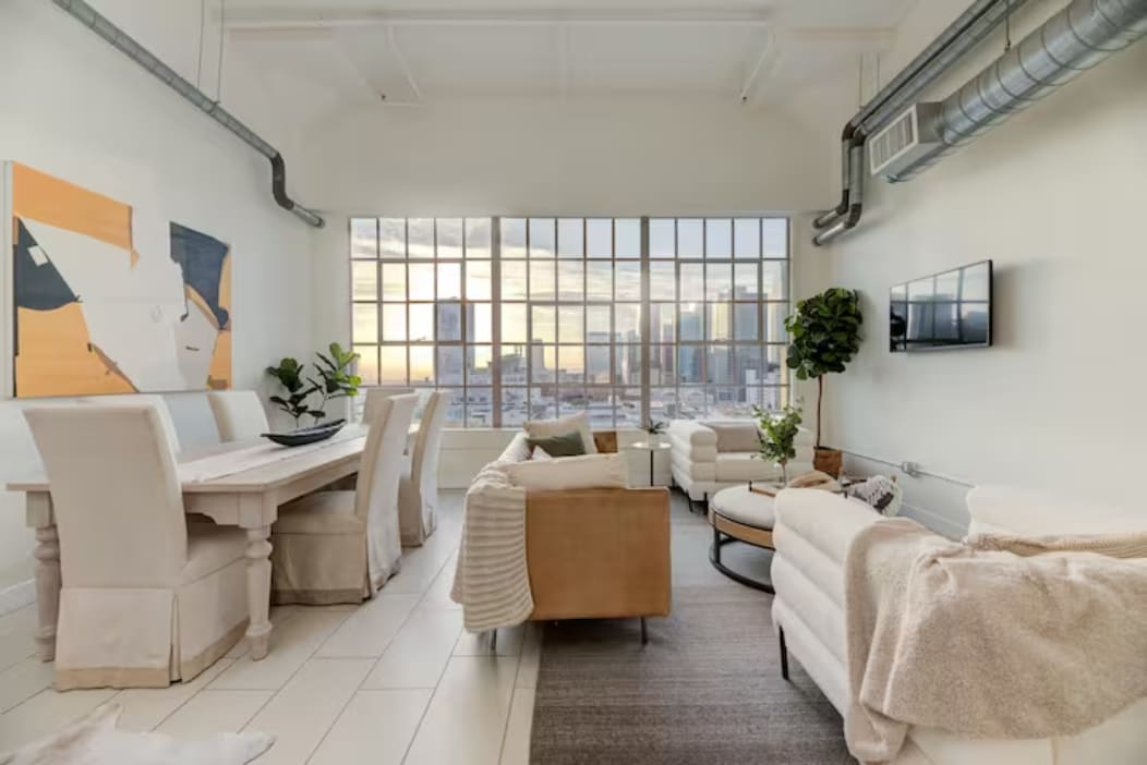 This modern loft is within walking distance to downtown's best bars and restaurants. It's also less than a mile from crypto dot com arena. The location even offers fast access to Dodger Stadium, The Greek, and Banc of California Stadium. Inside, is a large space with vaulted ceilings. Between the King bed in the bedroom and the sleeper sofa in the living room, up to 4 adults can sleep comfortably. 2 big screen TV's. One in the living room and one in the bedroom (which has a moveable stand).