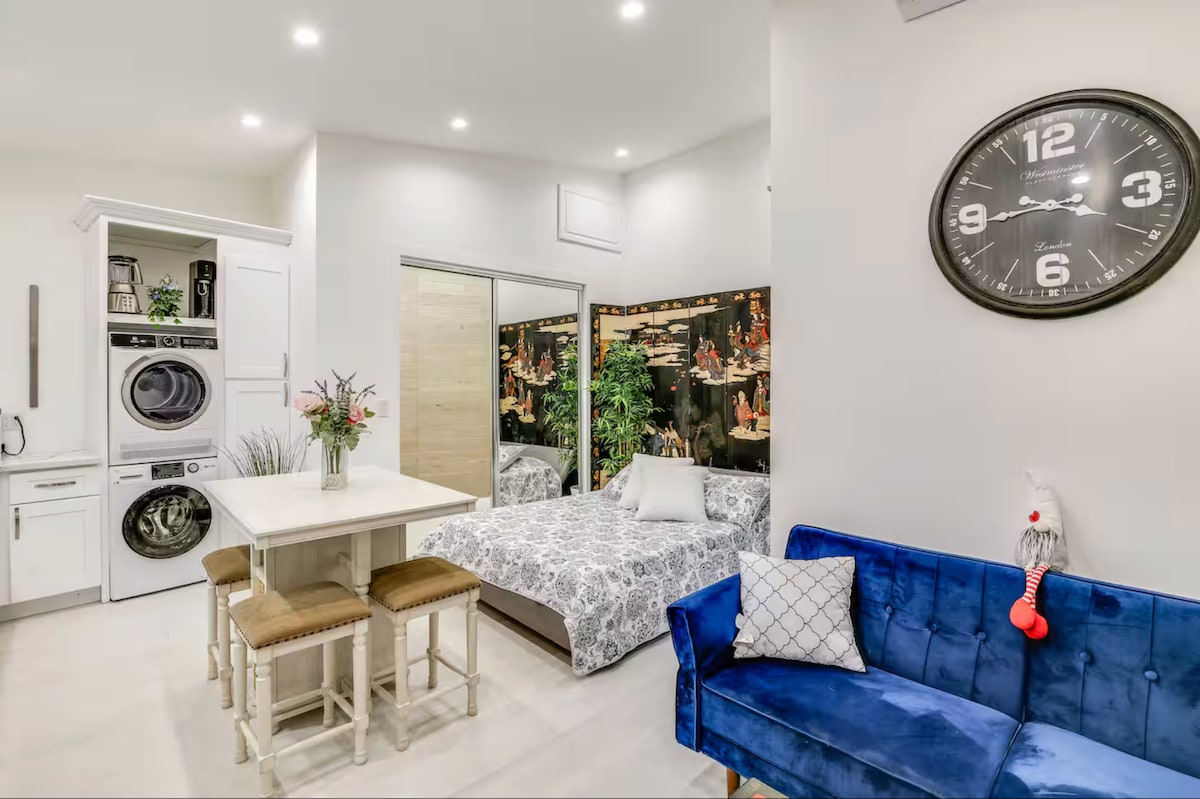 Please note the following details about our loft in the vibrant Arts District (1st St. and Vignes St). Cross streets can be checked before booking. - Conveniently located 30 mins from LAX - Just a 20-min drive from Hollywood - Only 10 mins away from the Staples Center Immerse yourself in a unique art experience at our loft, adorned with curated pieces from renowned artists, including graffiti and digital art.