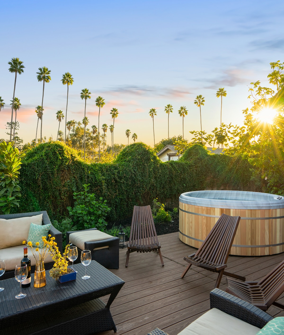 Rejuvenate and play the piano in a secluded hot tub (& cold plunge!) under the stars, surrounded by tropical plants & fruit trees, with Big-Sur-style luxury hidden in the heart of Silverlake. On this quiet cul-de-sac, you may forget you're just a short walk to the best cafes & restaurants of Silverlake. The house boasts two private view decks, a desert & citrus garden, a pond, a fire pit, & a detached meditation/work room. Featured as one of 12 "dream homes" for rent in Los Angeles Magazine!