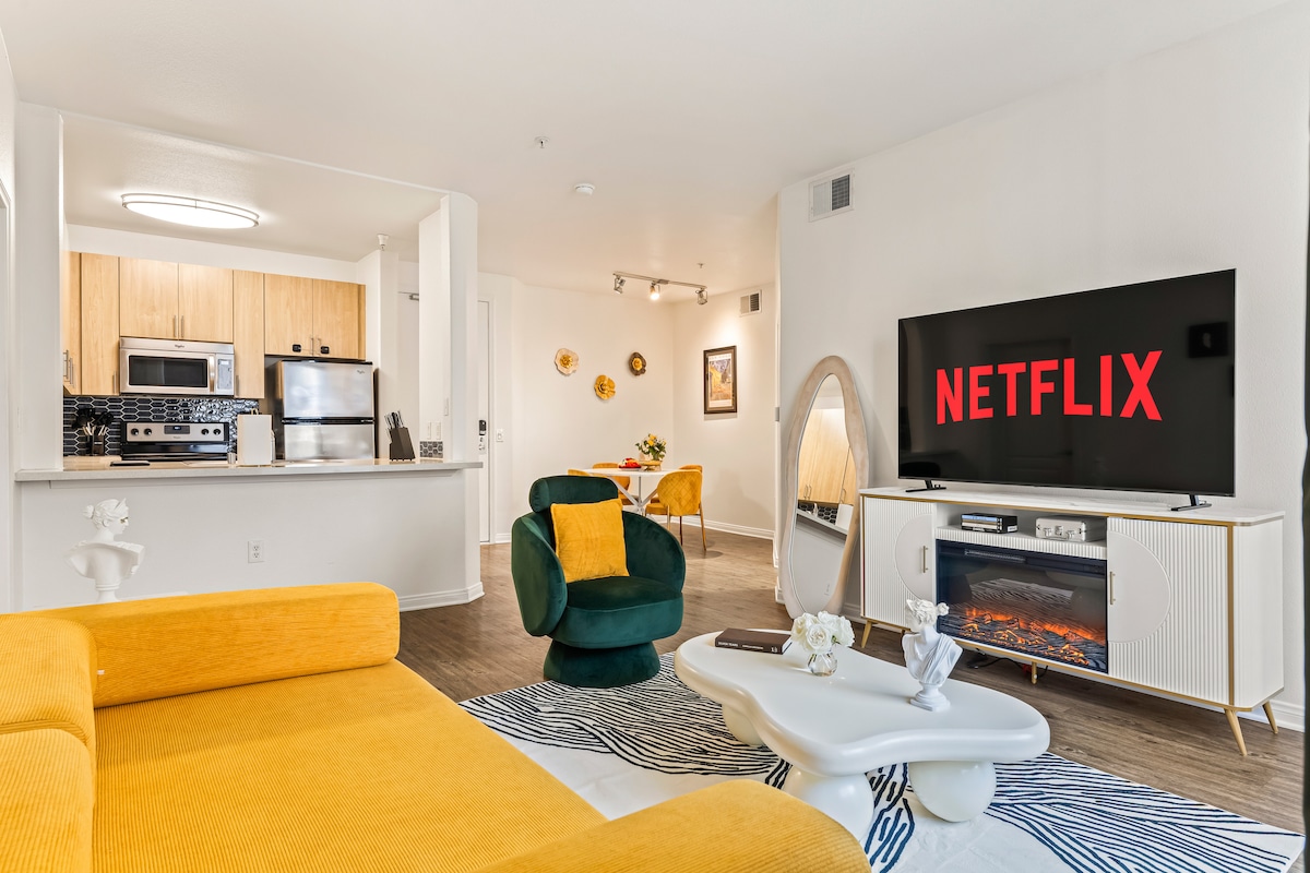 Indulge in the epitome of modern living at this stunning high rise oasis in Hollywood, offering a private balcony with partial views of the Hollywood Hills! This spacious retreat invites you to experience the best of Los Angeles. Nestled on the border of West Hollywood and Hollywood, you'll have easy access to the city's cultural hotspots and culinary delights. Amenities include: pool, sauna, steam room, gym, basketball court, tennis court. 1 parking spot included during your stay.