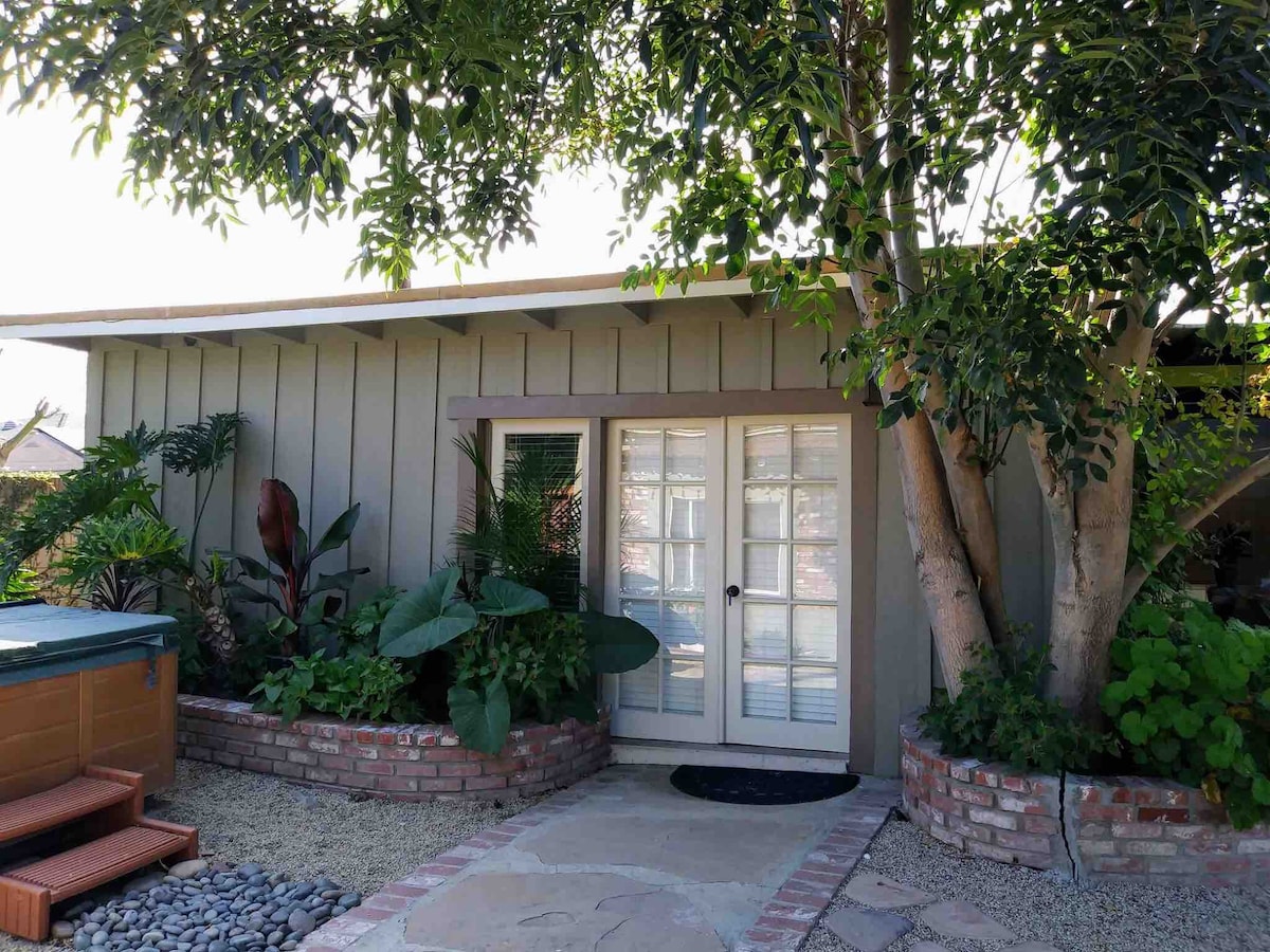 Unwind in our studio guesthouse, tucked away in a peaceful backyard retreat with a large private pool, cabana, massage chair, and hot tub. Immerse yourself in paradise, surrounded by tropical fruit trees, an organic garden, and an aquaponics system. Outdoor bliss awaits for 420 enthusiasts (outdoors only). Mention '420 friendly' while booking to receive a gift of our homegrown, pesticide-free cannabis. Max 2 guests, no exceptions. Kindly review our description and house rules before booking.