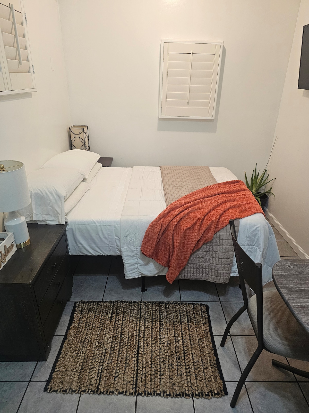 Modern Minimalist Studio — A Peaceful, Cozy Retreat ​This tiny yet inviting guesthouse studio is designed for comfort and efficiency. Inside, enjoy a thoughtfully equipped space with kitchen basics, central air/heat, and a smart TV. The true highlight is the "Zen-like" peacefulness of the backyard; step outside to find a quiet, serene atmosphere perfect for reflection. An ideal getaway for those seeking rest and a tranquil home base.