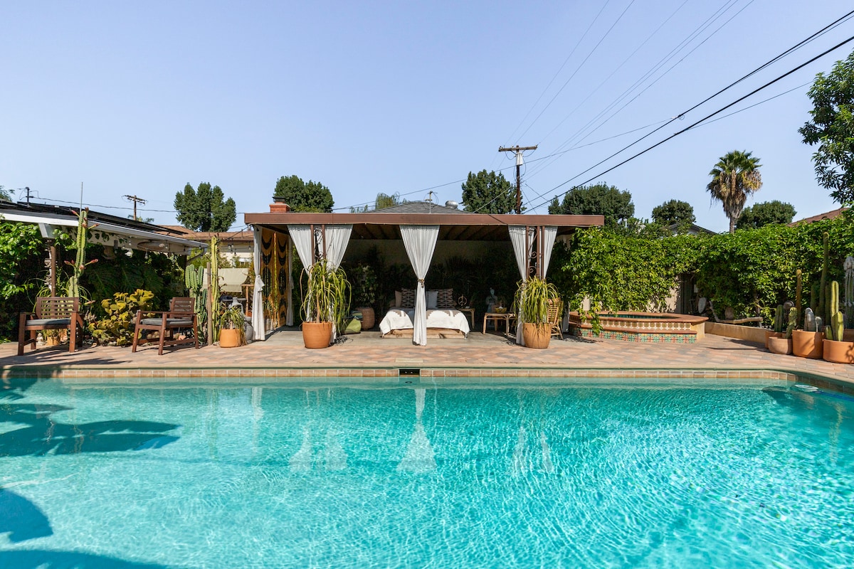 Unwind in our studio guesthouse, tucked away in a peaceful backyard retreat with a large private pool, cabana, massage chair, and hot tub. Immerse yourself in paradise, surrounded by tropical fruit trees, an organic garden, and an aquaponics system. Outdoor bliss awaits for 420 enthusiasts (outdoors only). Mention '420 friendly' while booking to receive a gift of our homegrown, pesticide-free cannabis. Max 2 guests, no exceptions. Kindly review our description and house rules before booking.