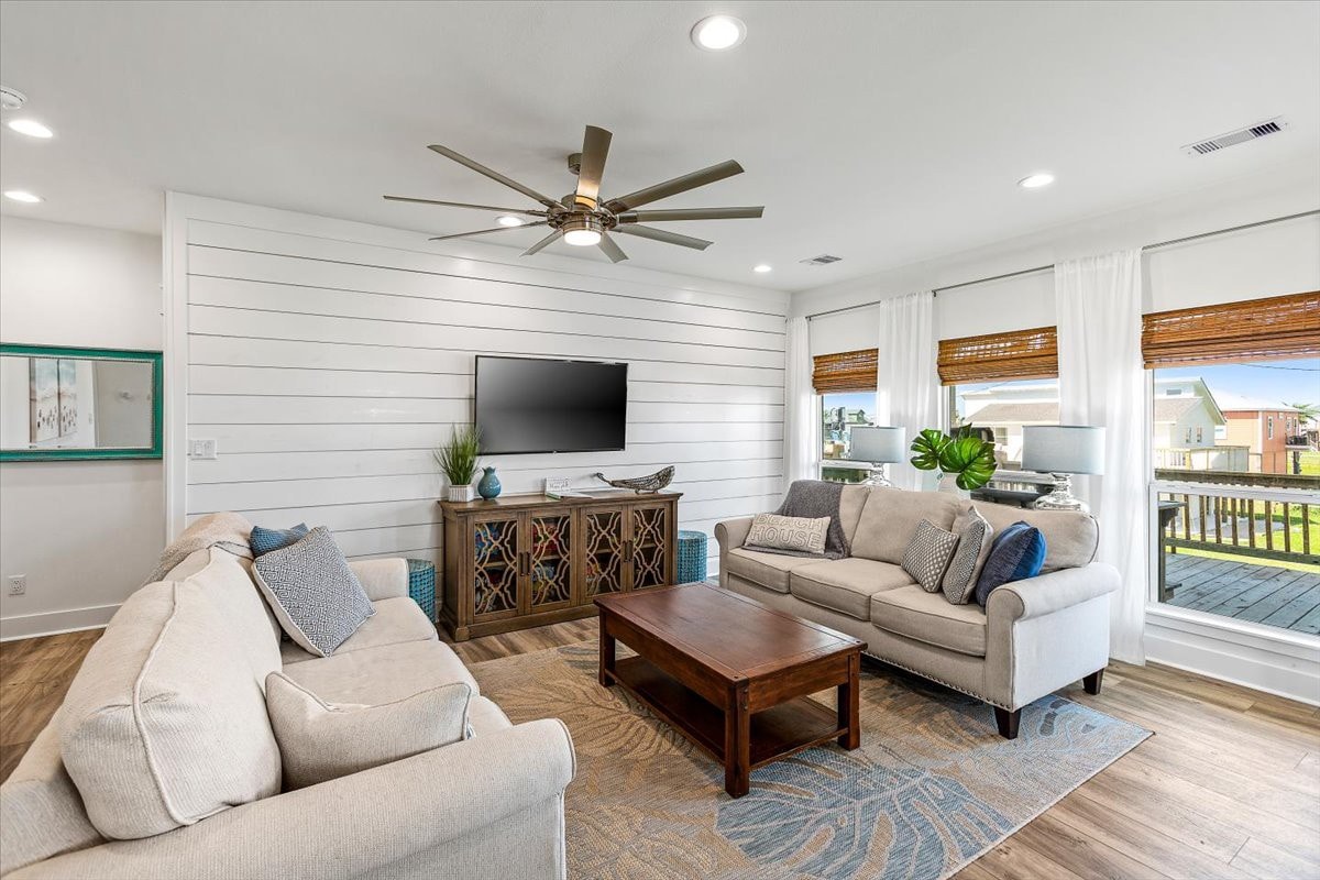 Relax with the whole family at this peaceful place to stay. Beautiful 2 bedroom home just half a mile from the beach. Sleeps a max of 7! The open concept allows more room for entertaining. The kitchen is fully stocked and ready to handle your family meals. Toddler/baby friendly as we include a highchair, packnplay, and sippy cups with every rental. The outdoor shower will be ready to wash away the sand after a fun day at the beach. Wifi is included. Dog friendly with a paid pet fee!