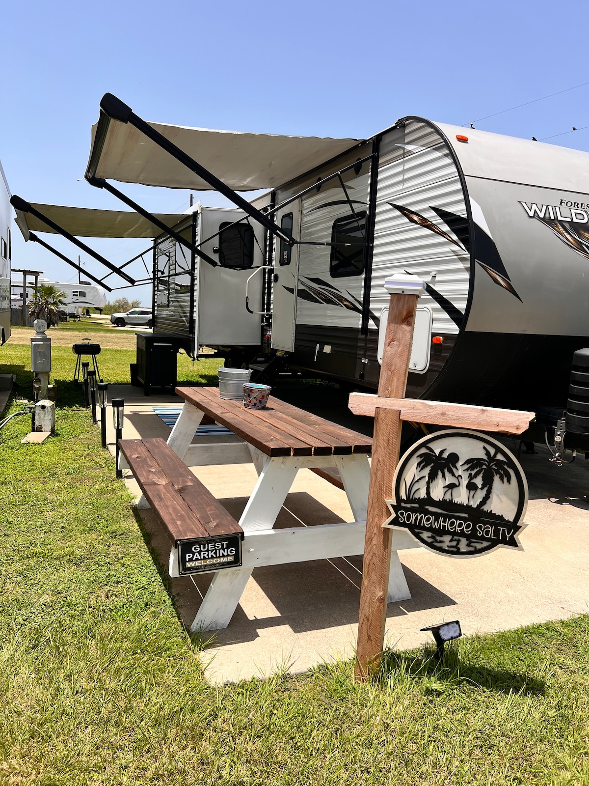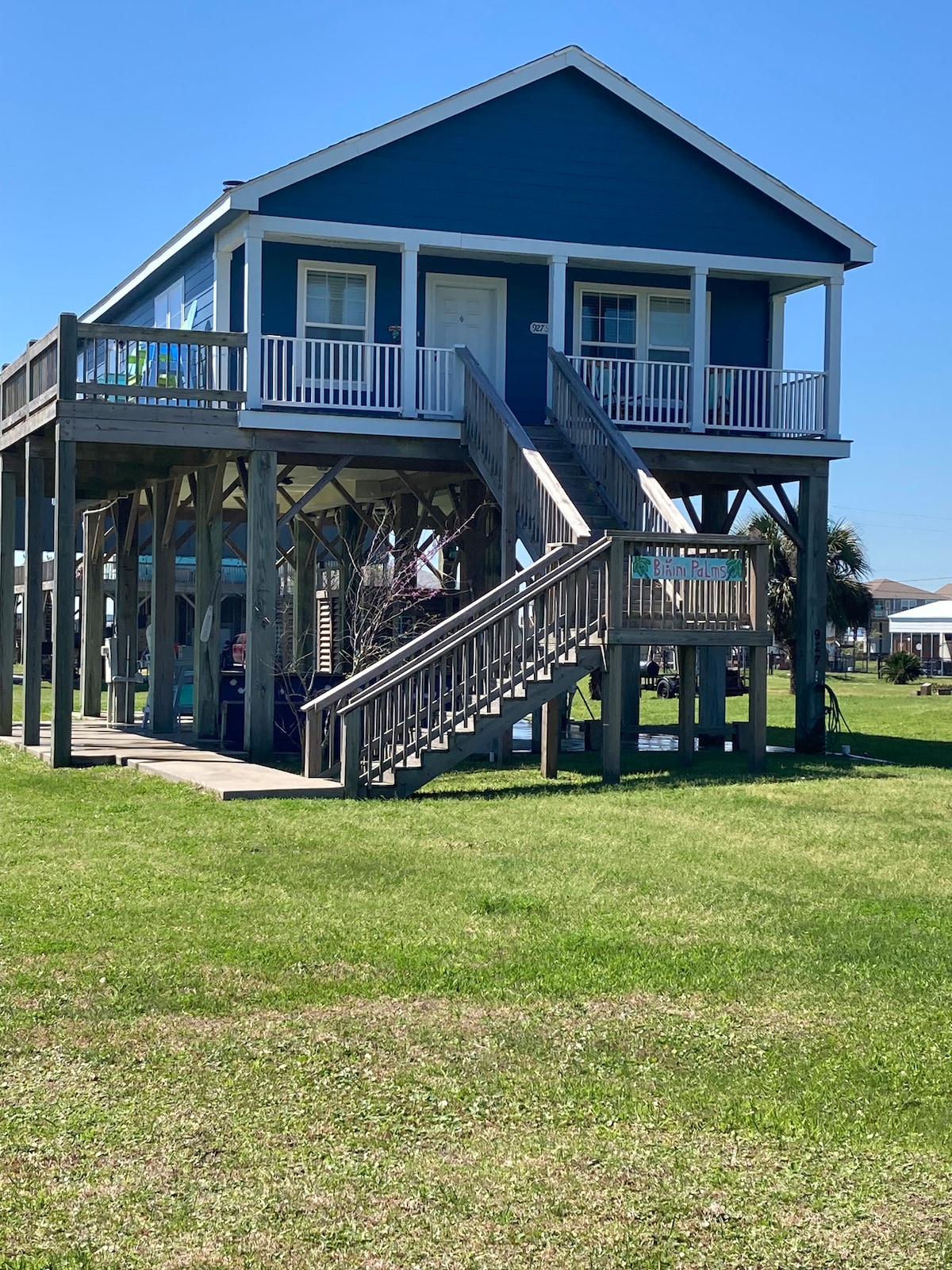 Bikini Palms is a 3 bedroom 2 bathroom, sleeper sofa, home that comfortably sleeps 8. Master has king, 2 bedrooms have Queens, sleeper sofa has full bed, chaise lounge and recliner rocker in living room. WiFi, Roku Tvs in every room with DVD players. Fireplace in den, washer/ dryer. Bar and shower under house with charcoal bbq. Easy access to the beach, nice walk the beach (5 -7 min) and even shorter drive. Come to beautiful Bikini Palms for a great Beach get away.
