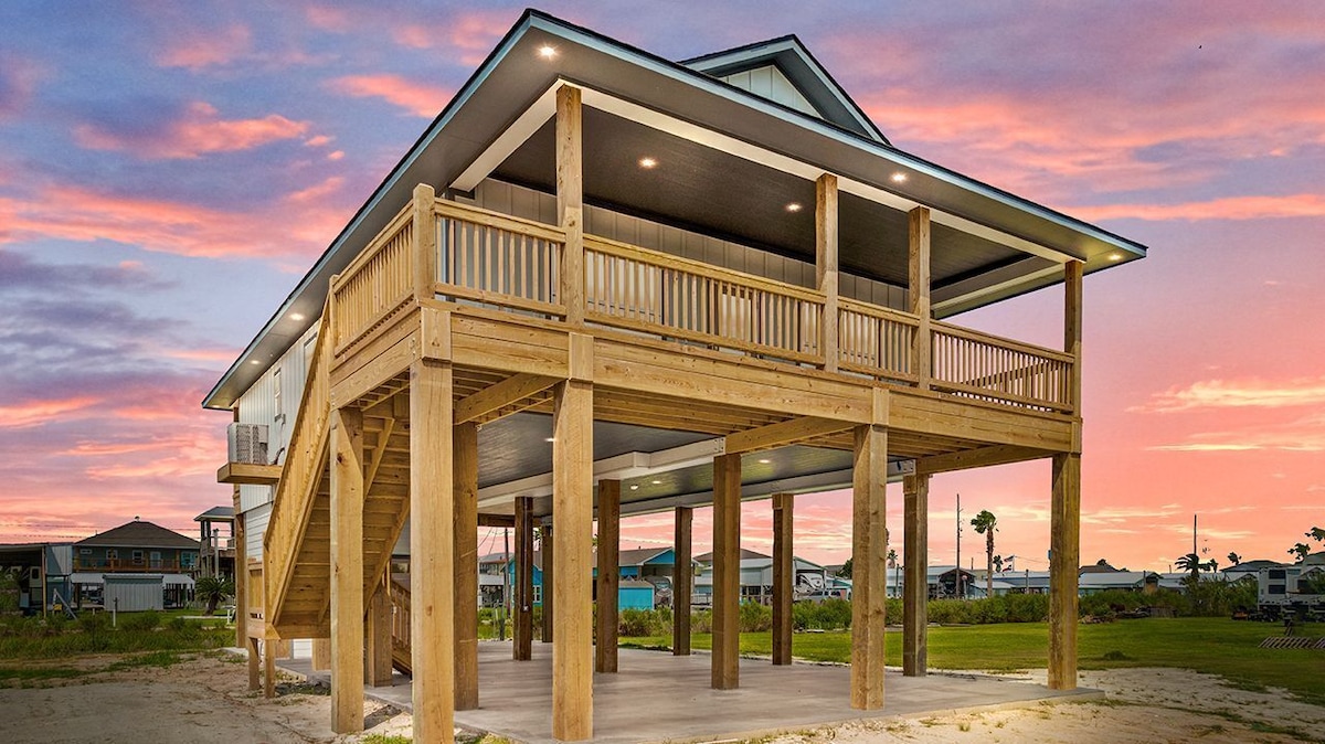 Come away to this amazing beach house in Crystal Beach with water views and walking distance to the beach. Outside, the property is all about lounging and entertainment, with a fire pit, hammocks, shady porches, sweeping balconies, a weber grill, and a ping pong table. Inside, you'll find 4 gorgeous bedrooms with a bonus kid-friendly sleeping nook, a spacious living area with fire place, and a well-stocked kitchen, perfect for families, friends, or couples. 5 min walk to the Beach