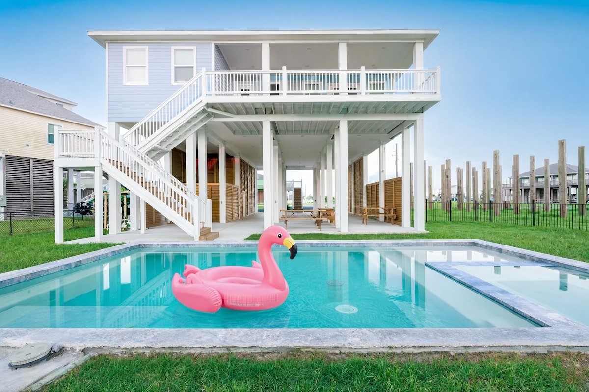 Beaches & Dreams Beach House, Crystal Beach (Near Galveston) ~ 7 person PLUNGE pool* w/ hot tub option ~ Sleeps 14 ~ 5 min walk to the beach or drive to park directly on the sand ~ Fireworks/Bonfires OK @ the Beach** ~ Backyard Fun: CANAL FISHING + Tiki Bar + TV + Charcoal Grill ~ 2 balconies to enjoy sunrise views & the ocean breeze (obstructed ocean views) *Plunge Pool Min Temp = 80F **Check Galveston County website for restrictions/bans