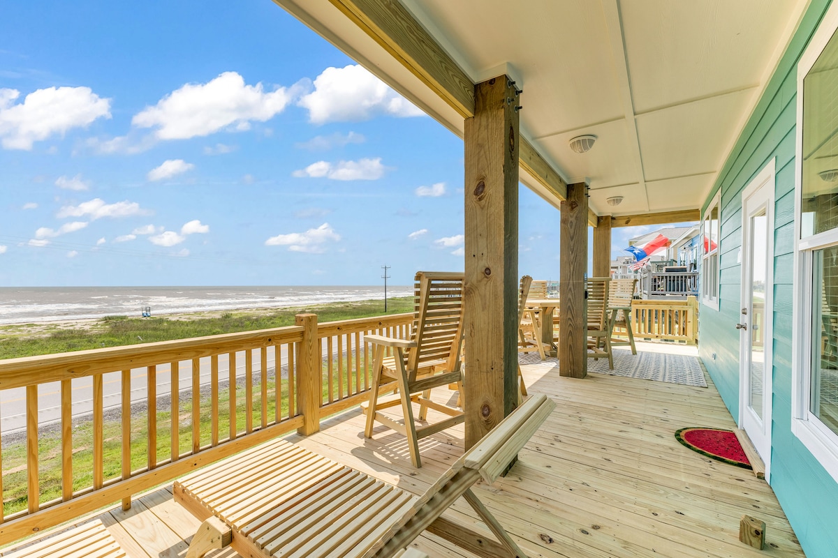 Unobstructed ocean views! See all the way down the beach to Galveston. Four bedrooms and 3 1/2 baths. Plenty of space and several decks for enjoying the sun. You have space to entertain, inside the beach home , but also underneath where you will find a large built in bar, propane/charcoal bar b q , swings, hammock loft and outdoor shower. Fenced in yard. Private walkover to the beach. Gourmet kitchen with butlers pantry. Tv's in every room. Master has soaking tub with beach view! Sleeps 14