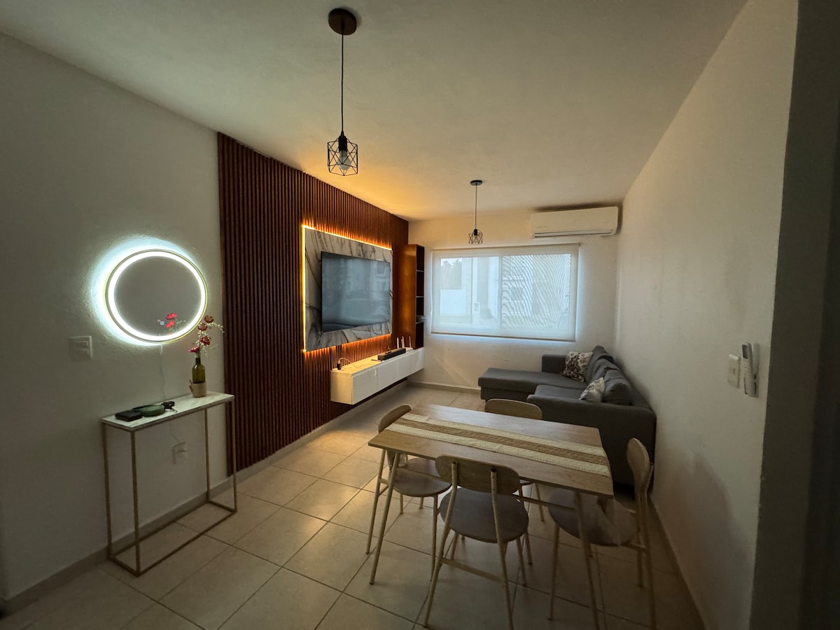 Vive la experiencia de viajar y sentirte en casa, contamos con todo para que tu estancia sea placentera, confortante y amena. Tenemos todo cerca, a 1 minuto del de la playa, 20 minutos del aeropuerto, designamos espacios seguros para tu estancia Comfort dentro de un edificio con acceso controlado, privado y sumamente seguro. Dos cajones de estacionamiento. 3 recamaras. Pet Friendly (mascotas). El departamento NO incluye la disponibilidad de la Alberca.