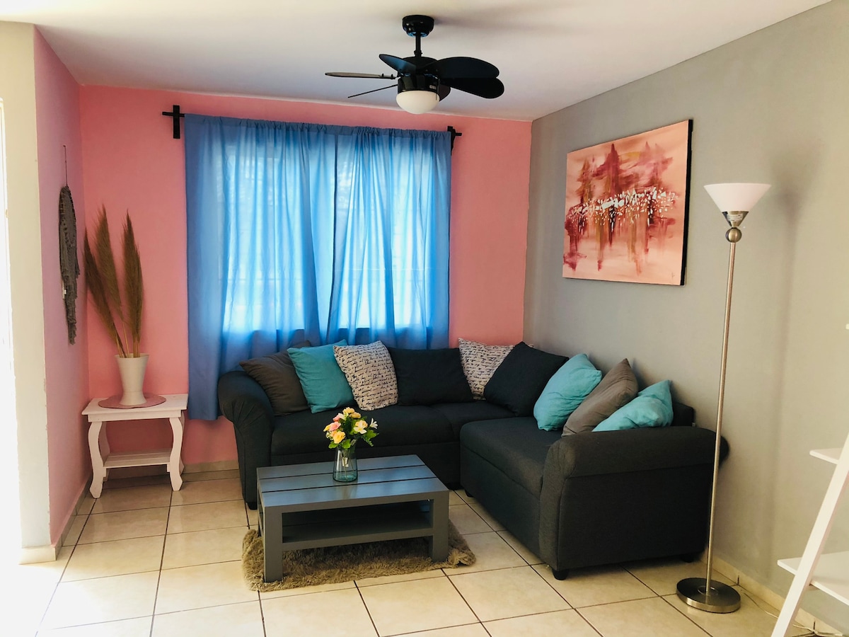Disfruta tu visita a Veracruz en nuestra casita a 15 minutos de la playa, acogedora, cómoda e independiente, con todo lo necesario para cortas y largas estancias. No comparten áreas comunes, es solo para ustedes: WiFi, cochera techada y cerrada para 1 auto, hamaca, mesa de ping pong, antecomedor. En la planta alta se encuentra la recamara con Aire Acondicionado y Tv con Cable, balcón, baño completo. Área adaptada con refrigerador, microondas, cafetera, estufa de inducción y lavatrastes.