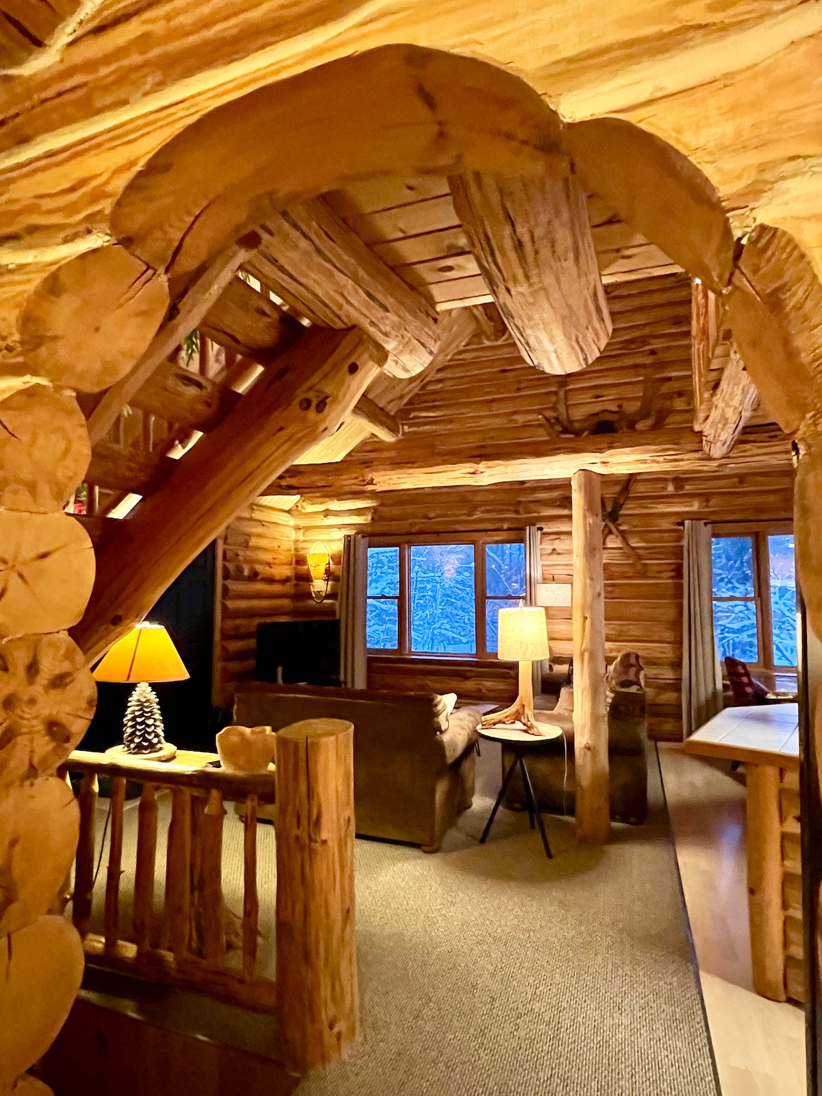 Thompsonville Lodge is a spacious log lodge home. Your family will love the spacious accommodations for up to 12 with 8 beds, 2 full and 1 half baths. - Outdoor Hot Tub - Outdoor wood burning sauna - Loft with log queen/queen bunk bed - 75" TV w/ Sonos Surround Sound, YouTube TV, Netflix, Disney+ & Spotify - Gas fireplace for ambience and heat - High quality mattresses - Log ski & snowboard rack - Heated garage - Polywood outdoor and Solo Stove firepit - Well stocked kitchen