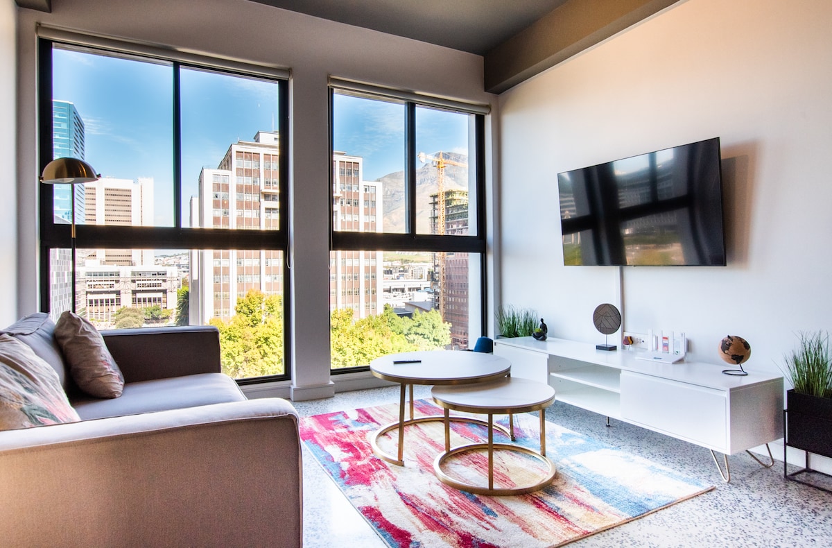 A chic, modern apartment with a big balcony, in the heart of trendy Bree Street, surrounded by top-notch restaurants and just a short walk to all city highlights. Stylishly decorated with all amenities for a super comfortable stay. Perched on the 21st floor, enjoy breathtaking views of the city, Stadium, Robben Island, Signal Hill, and the sparkling sea. Relax on the rooftop terrace with a refreshing drink from the bar. Just a stroll away from the CTICC and the V&A Waterfront. @CapeTown16onBree