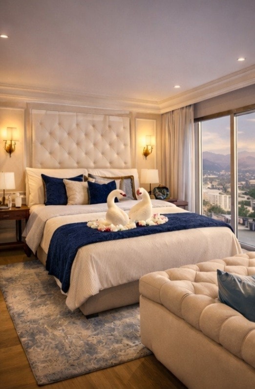 Stay near everything you want to visit. Indulge in luxury, featuring a spacious layout with a king-size bed, open en-suite bathroom with a freestanding bath and double vanity, desk, smart TV, and a tea/coffee station. Relax amidst calming decor, while floor-to-ceiling windows offer expansive views of the cityscape.