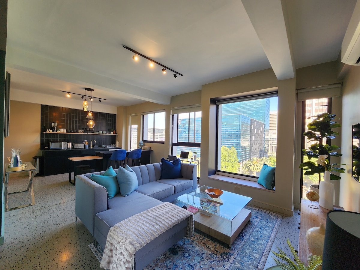 Plan your Cape Town getaway and head to this chic downtown apartment! Ideal for solo travelers or couples, this 1-bedroom, 1-bathroom unit offers a well-equipped kitchen, a Smart TV, Alexa, a washer and dryer, and a gorgeous Rooftop terrace. Spend your days relaxing at the pool, visiting the Markets, The V&A Waterfront, or exciting attractions like Table Mountain and superb restaurants and bars. If you’re interested in venturing out, 400m to CTICC, take a drive to tour the sights in Cape Town!