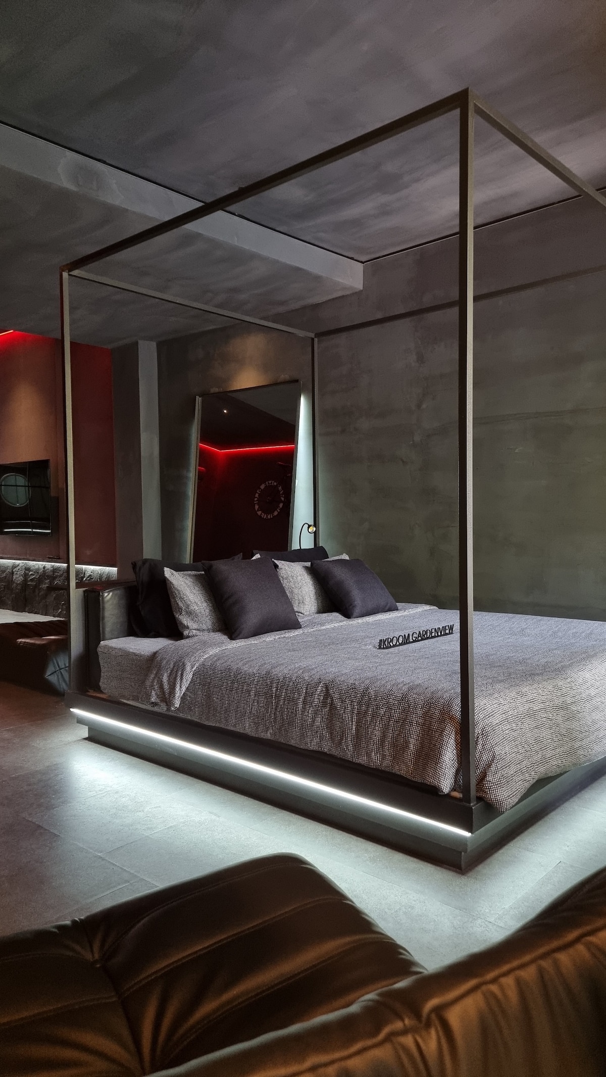 As you step inside this stunning house , you'll be greeted by a spacious and airy living area with ample natural light streaming in through a large special stained glass skylight in the heart of the living room. The open concept floor plan seamlessly flows from the beautiful open- space bathtub through bed-living room into a spacious kitchen with floor-to-ceiling glass doors that open onto the garden. This place is just an luxurious greenery oasis and perfect choice for travelers to unwind