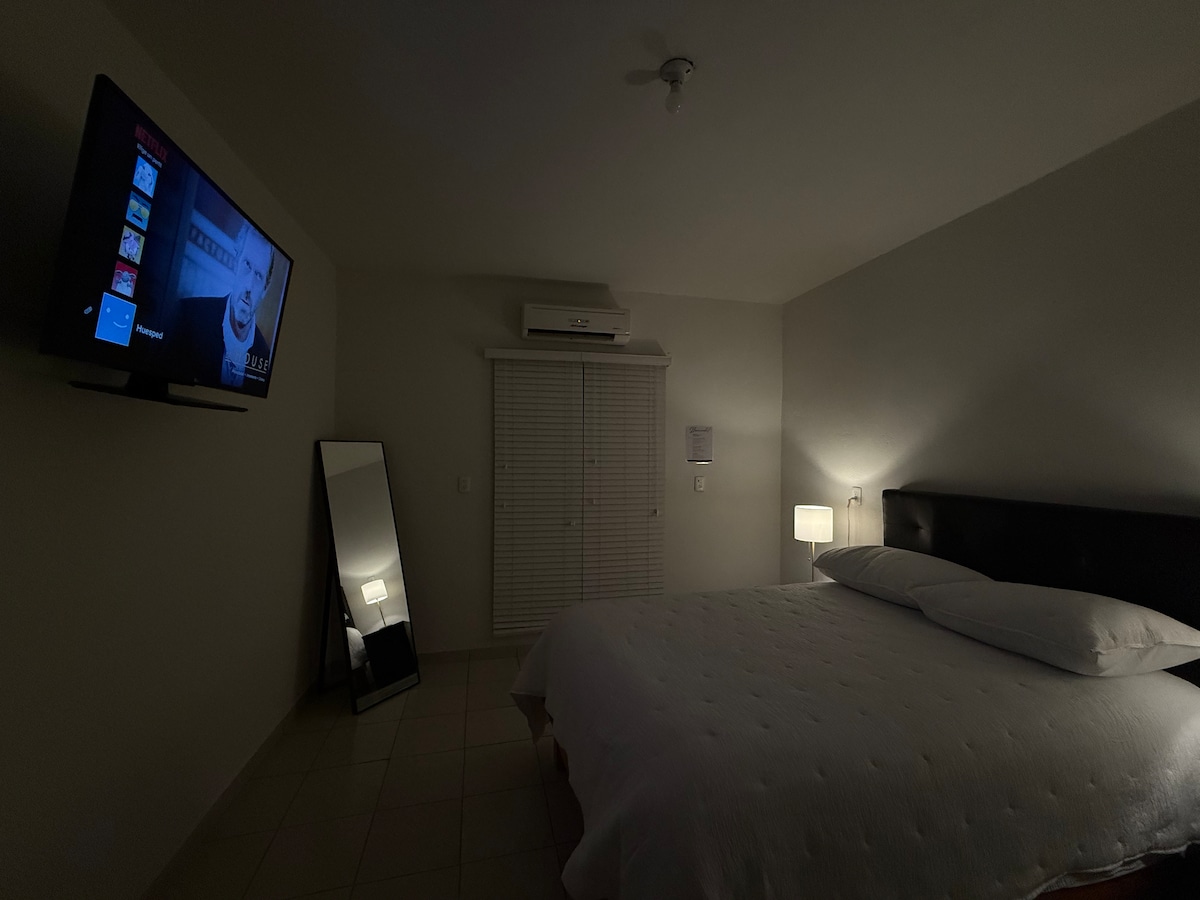 Departamento pequeño pero muy cómodo con todo lo que necesitas para pasar unos días agradables. Con capacidad para máximo 6 personas, cuenta con internet, moderno ventilador de techo con bocina de Bluetooth, 2 recámaras con tv con cable y minisplit frío/calor, cocineta con utensilios de cocina, frigobar, microondas, baño pequeño y en su área de patio cuenta con asador, área de fogata, medio baño, además de su alberca (no climatizada) exclusiva para los huéspedes de este alojamiento.