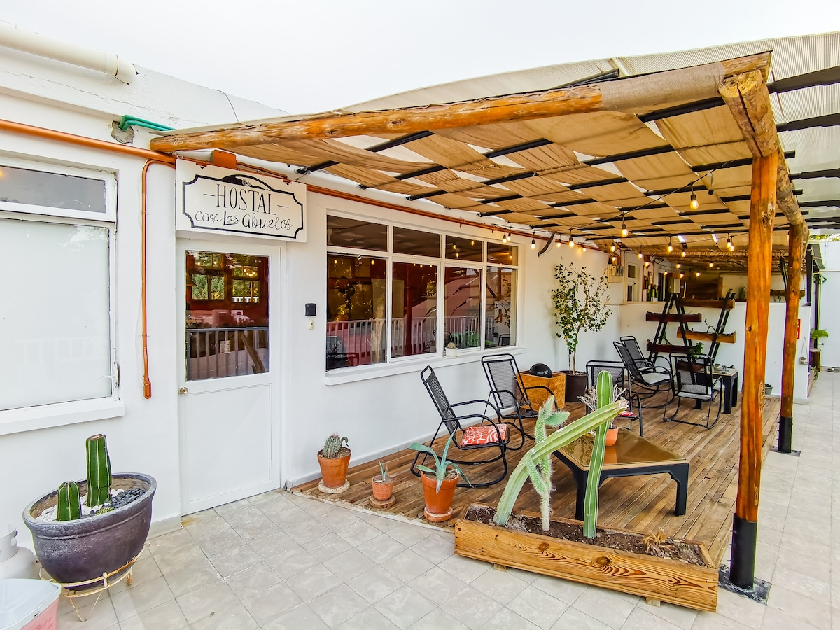 Hostel Casa Los Abuelos es un acogedor alojamiento de ambiente 100% familiar con habitaciones privadas y compartidas, todas ideales para un cómodo descanso, además contamos con cocina compartida, estacionamiento y terraza con área de fogatero. Gozamos de excelente ubicación, a solo 2 cuadras del centro. Cualquier pregunta no dudes en escribirnos, ¡Estaremos muy contentos de poder recibirte!