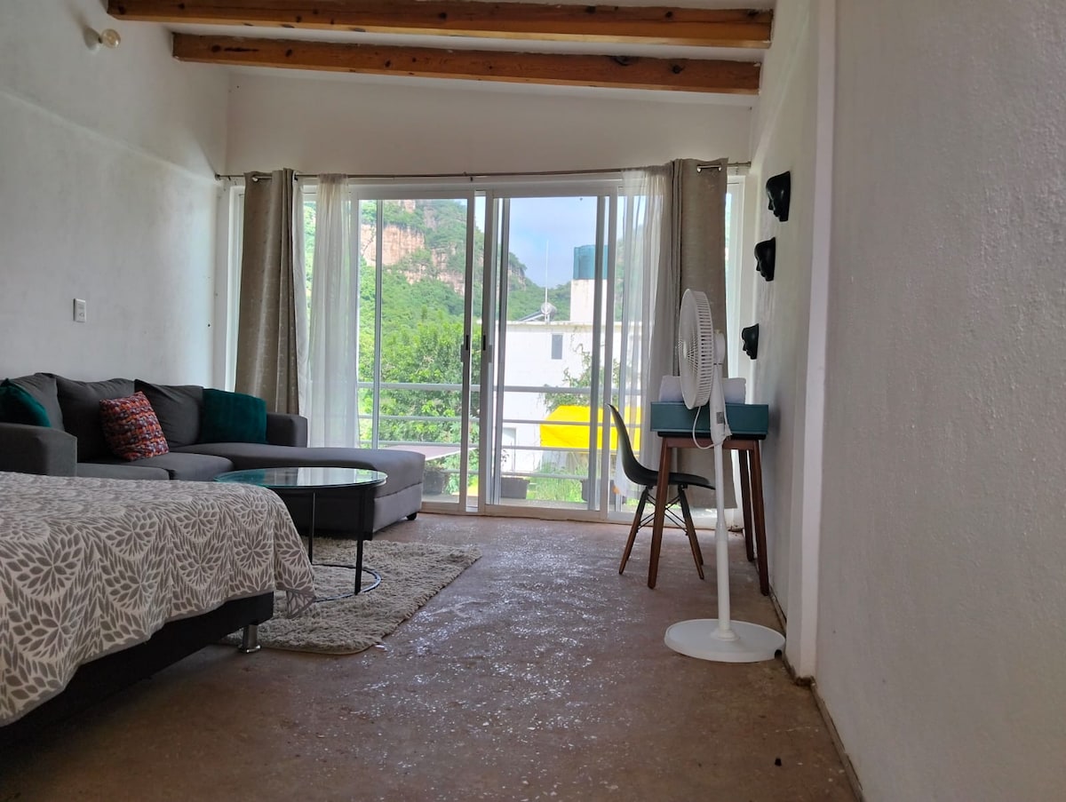 Este lugar lleno de estilo está cerca de todo lo imprescindible con detalles únicos por el diseño de la habitación, la habitación aparte de tener lo necesario para poder descansar cuenta con roof garden asi como una vista increíble hacia todos los cerros de Tepoztlán, incluyendo el icónico cerro del Tepozteco, se encuentra a 5 minutos del zócalo municipal caminando.