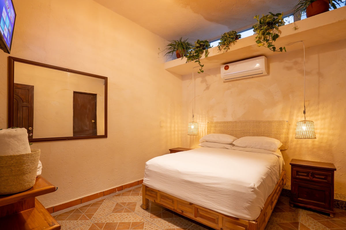 Habitación acogedora con diseño cálido y estilo natural, ubicada en el corazón del centro de Tepoztlán. Ideal para quienes quieren estar cerca de todo, con acceso caminando a restaurantes, bares, terrazas, cafés, cultura, folklore y la vida del centro. Un espacio cómodo y con buena vibra para descansar después de disfrutar el ambiente del pueblo. Estacionamientos públicos a unos pasos y por la noche en la calle de El Hotelito.